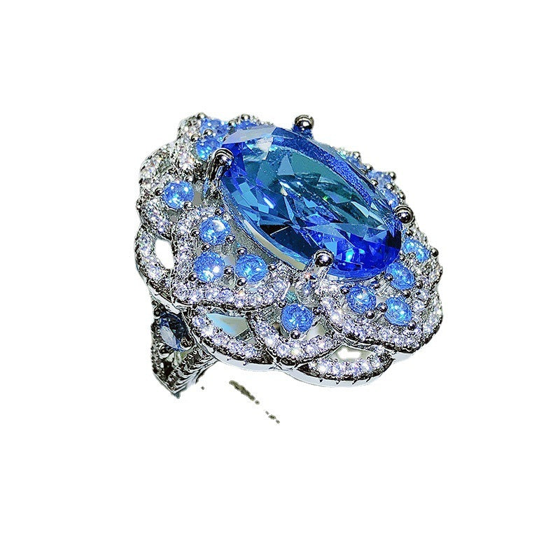 Open Brass Ring For Women Adjustable Ocean Blue Gem Geometric Design Triangle Ellipse Wave With Intricate Lines