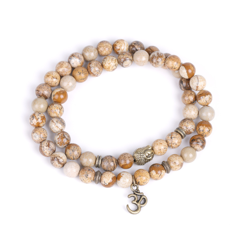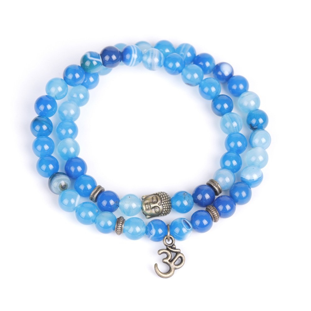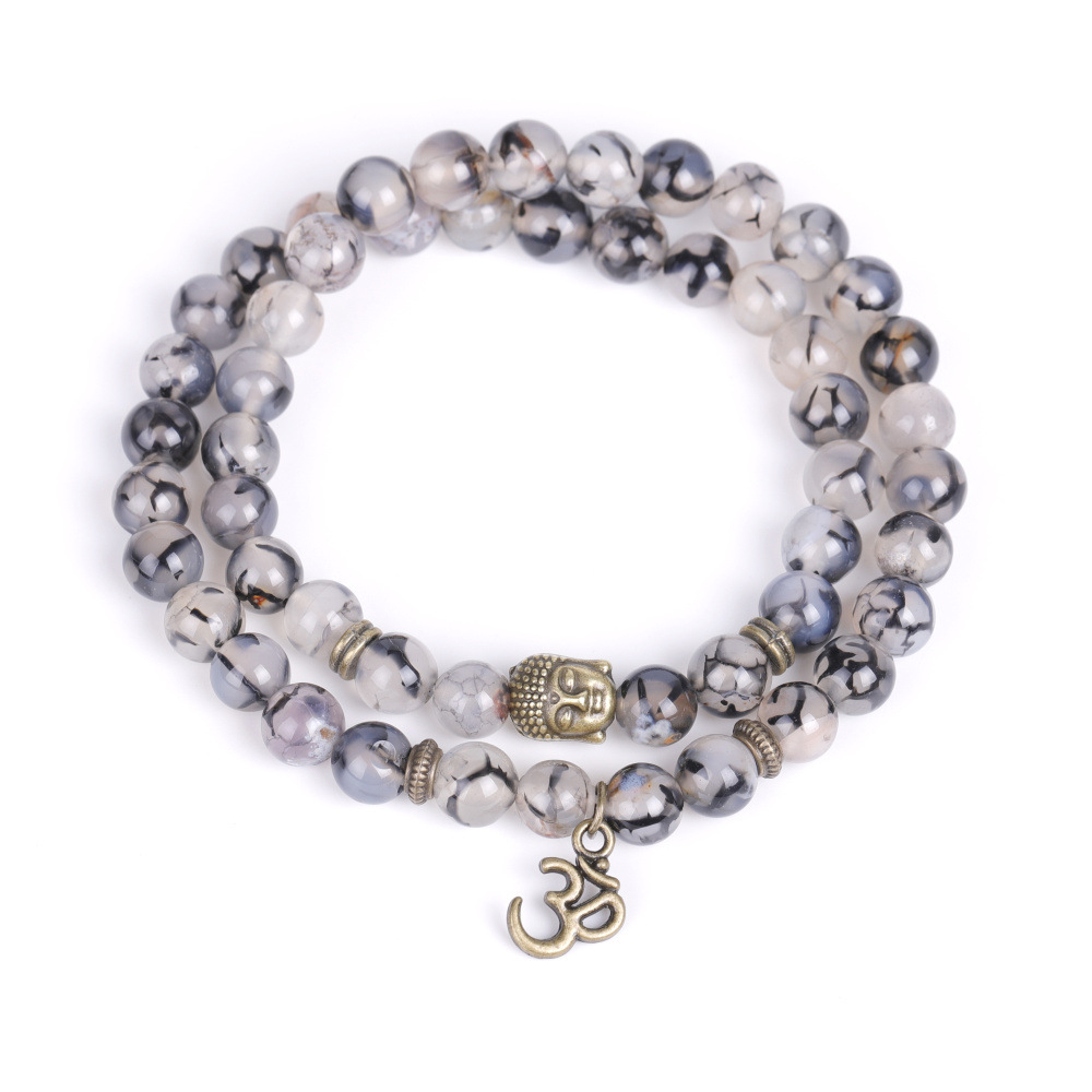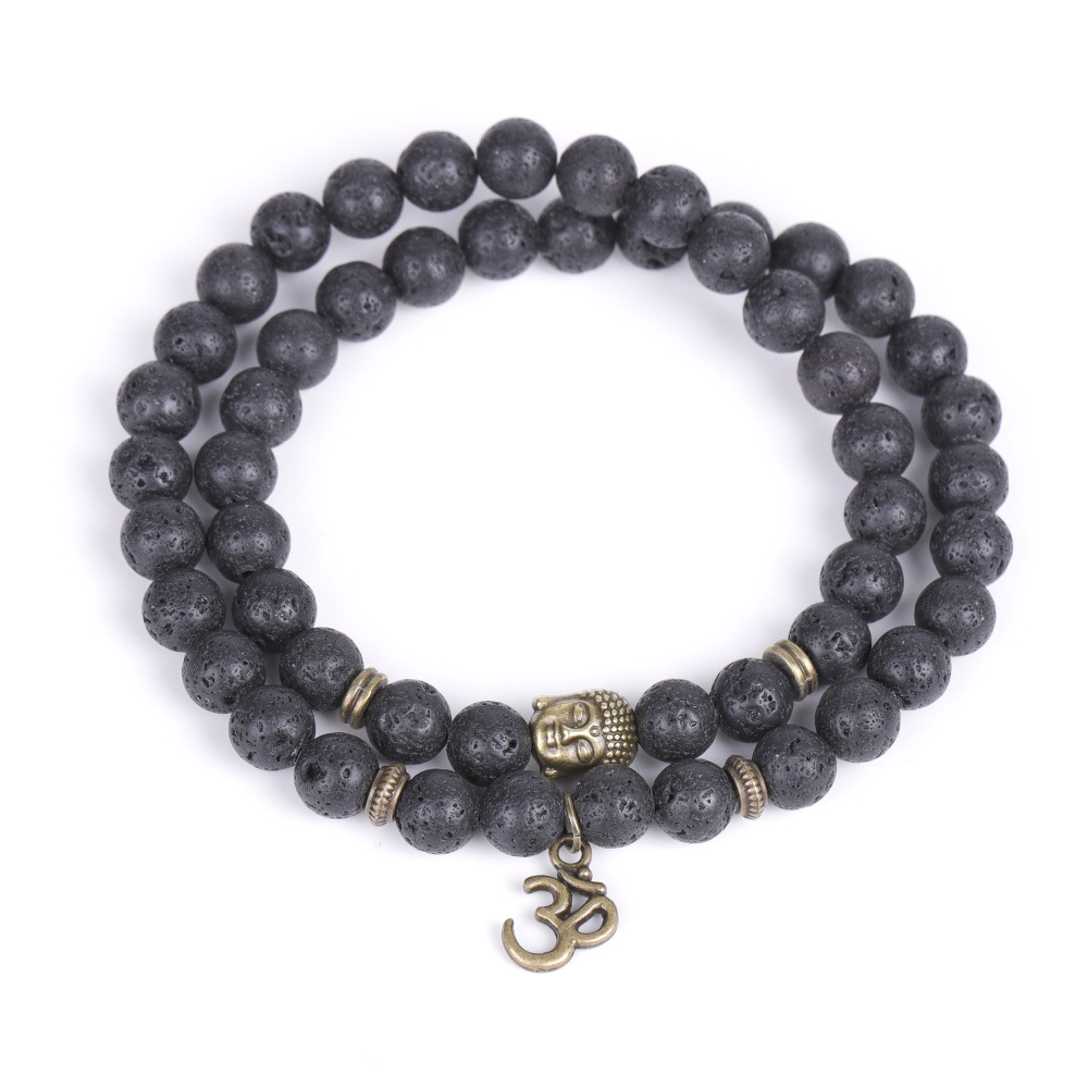 Unisex Volcanic Stone Double Row Bracelet Bronze Buddha Head Agate Geometric Totem Jewelry Religious Symbolic Accessory