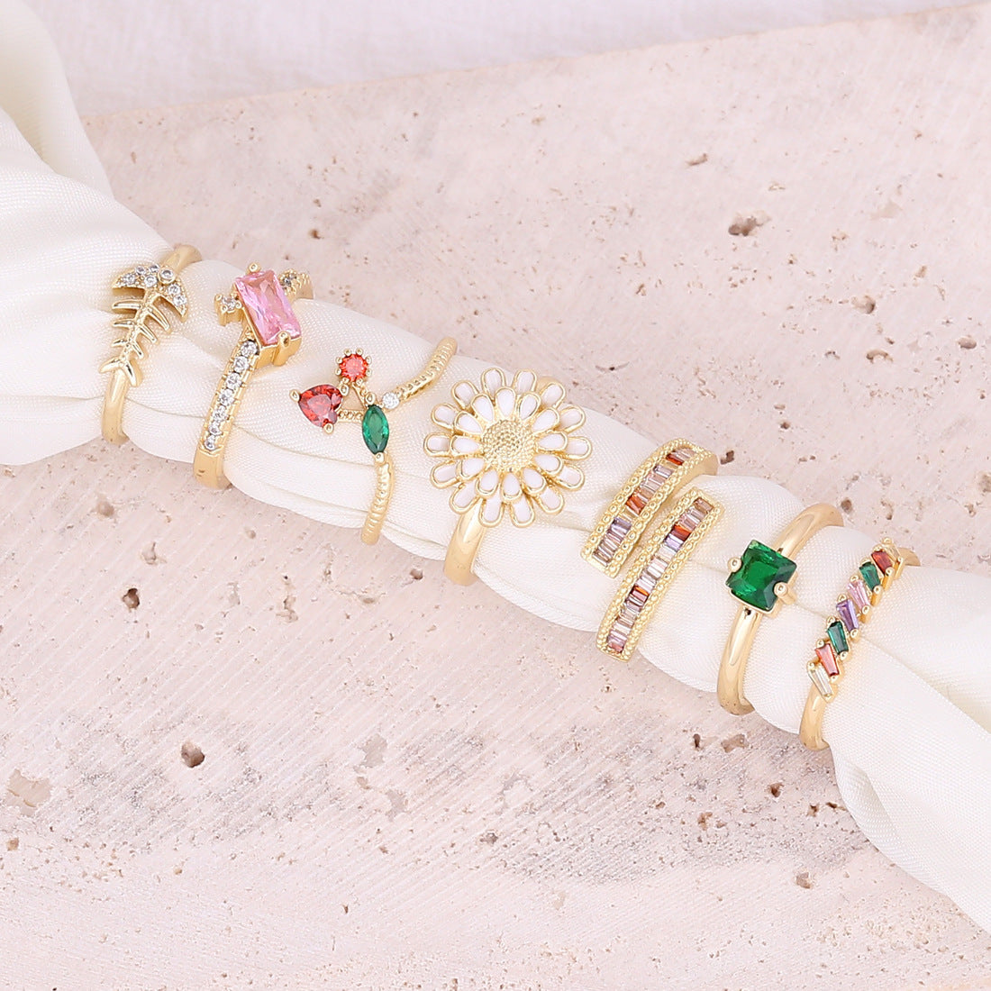 Women Adjustable Copper Ring With Zircon Daisy And Cherry Design Electroplated Jewelry Gift For Her Girls Charm