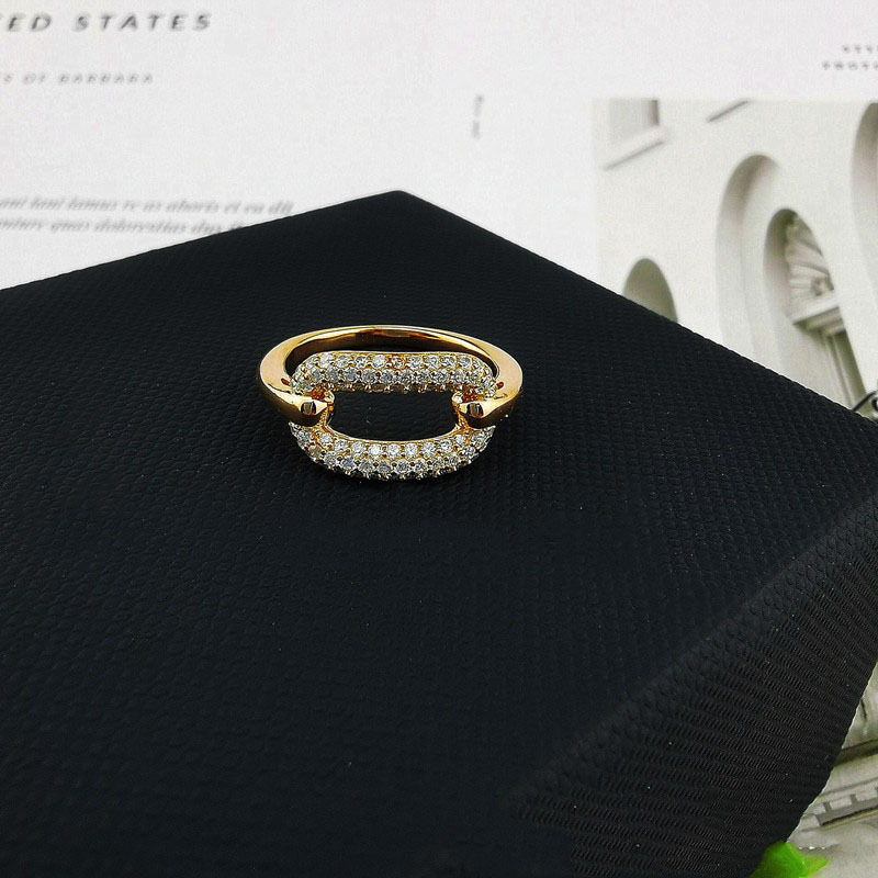 Geometric Lock Ring Crystal Inlaid Zircon Embellished Coppery Gold Plated Elegant Daily Wear Statement Jewelry