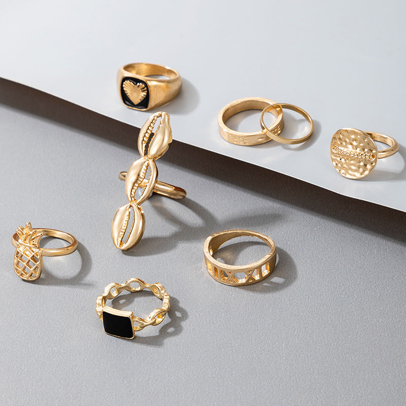 Womens Fashion Rings Set of 8 Alloy Black Heart Pineapple Shell Geometric European American Rings Rings Set of