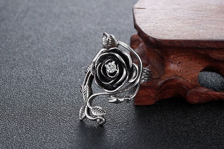 Black Rose Stainless Steel Band Ring With White Diamonds
