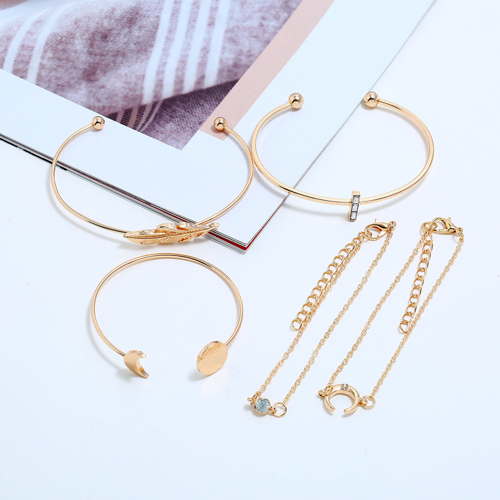 Womens Vintage Bracelet Set Crescent Feather and Leaf Design Rhinestones Crystal Inlay Zinc Alloy Jewelry Ring