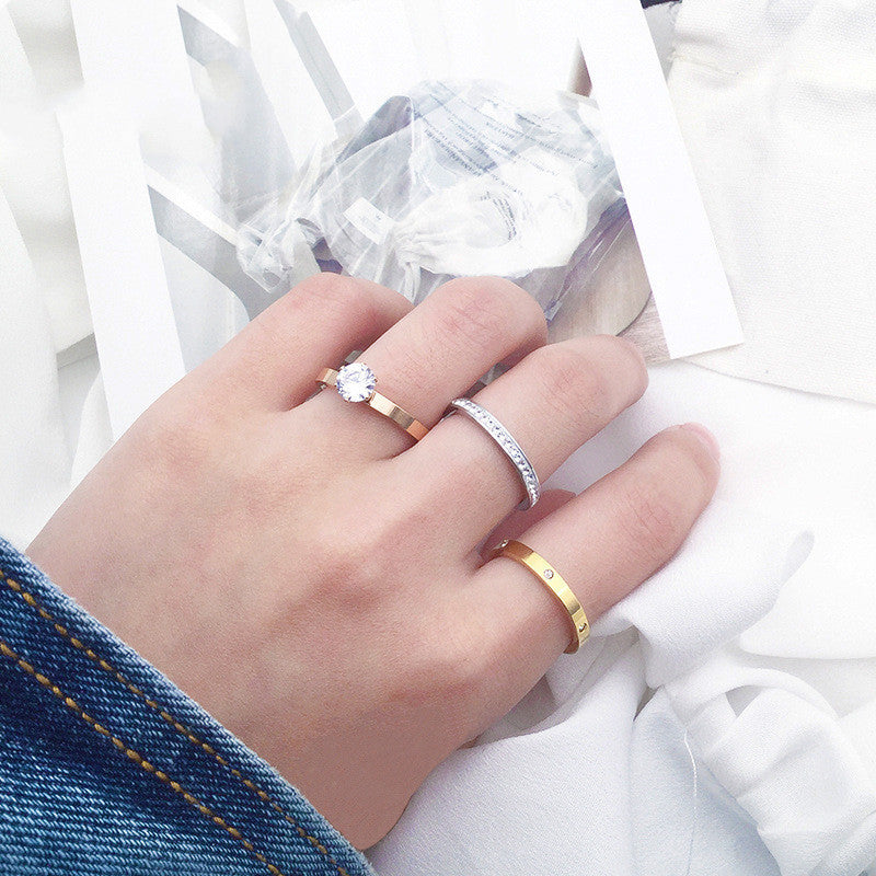 Womens Titanium Steel Three Piece Ring Set Six Claw Simulated Diamond Rose Gold Tone Durable Fashion Jewelry Gift