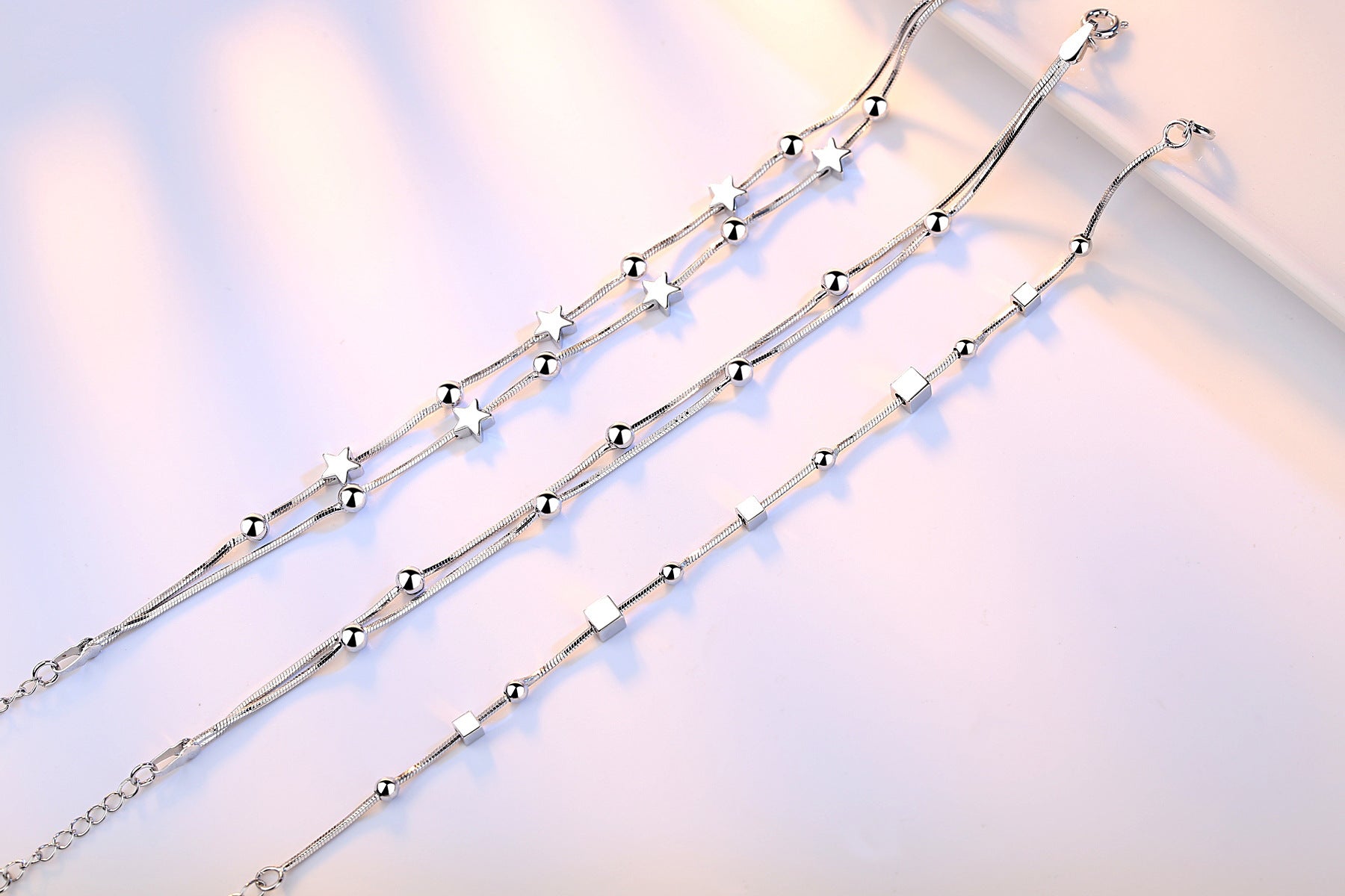 Sterling Silver Bracelet For Women And Girls With Five Point Star Ball And Square Charms Platinum Finish Shine