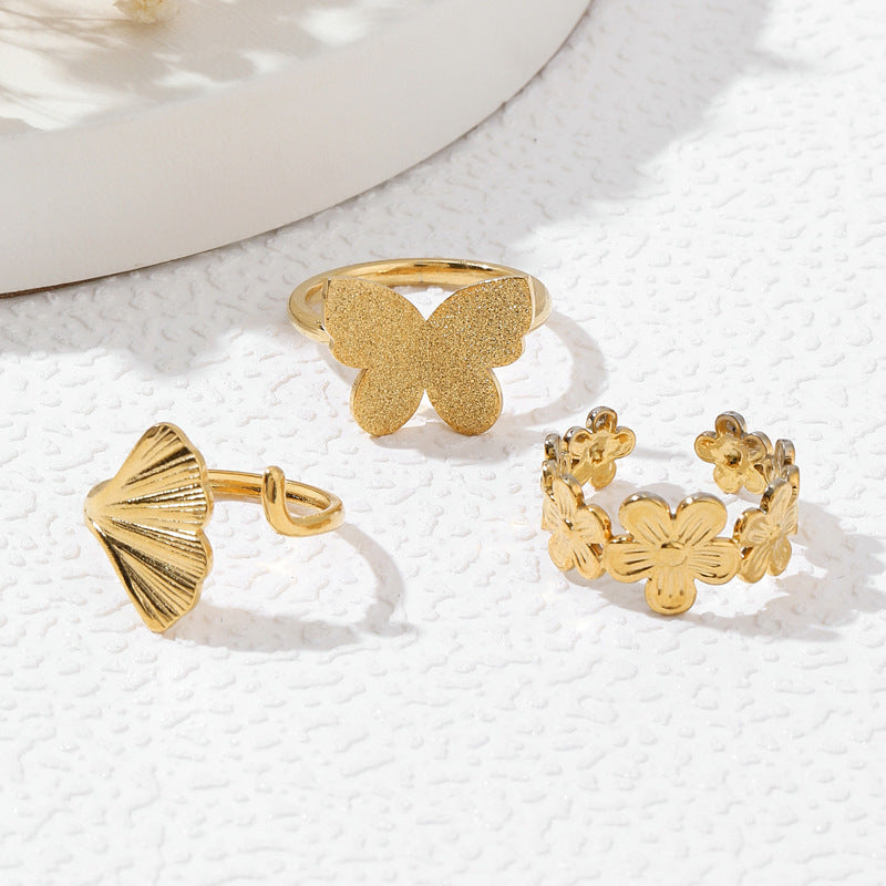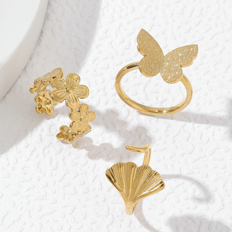 Womens Adjustable Open End Ring Stainless Steel Flower Butterfly Ginkgo Jewelry Fashion Flexible Electroplated