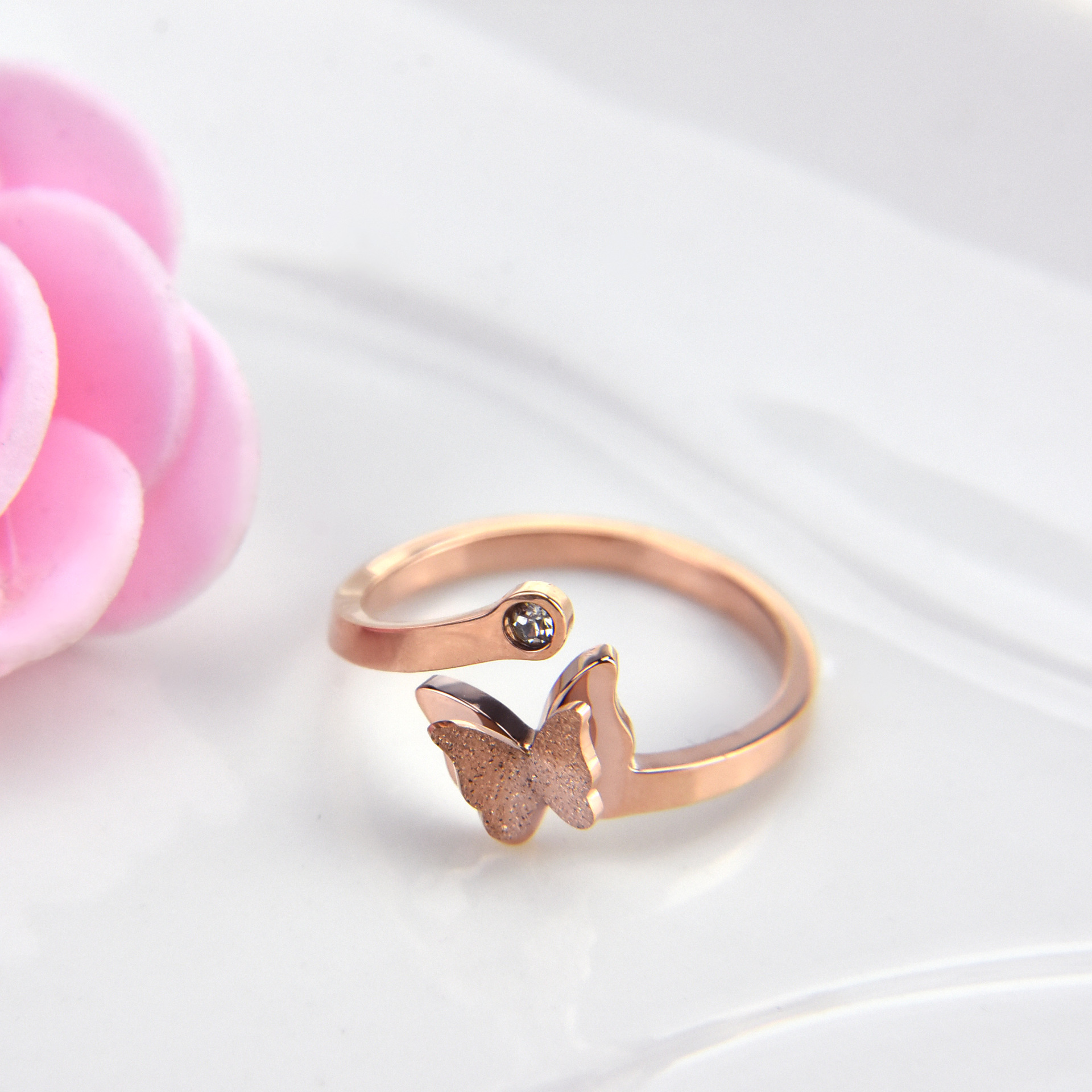 Frosted Butterfly Ring Titanium Steel Rose Gold Plated Artificial Gemstone Jewelry For Lovers Festival Gift Keepsake
