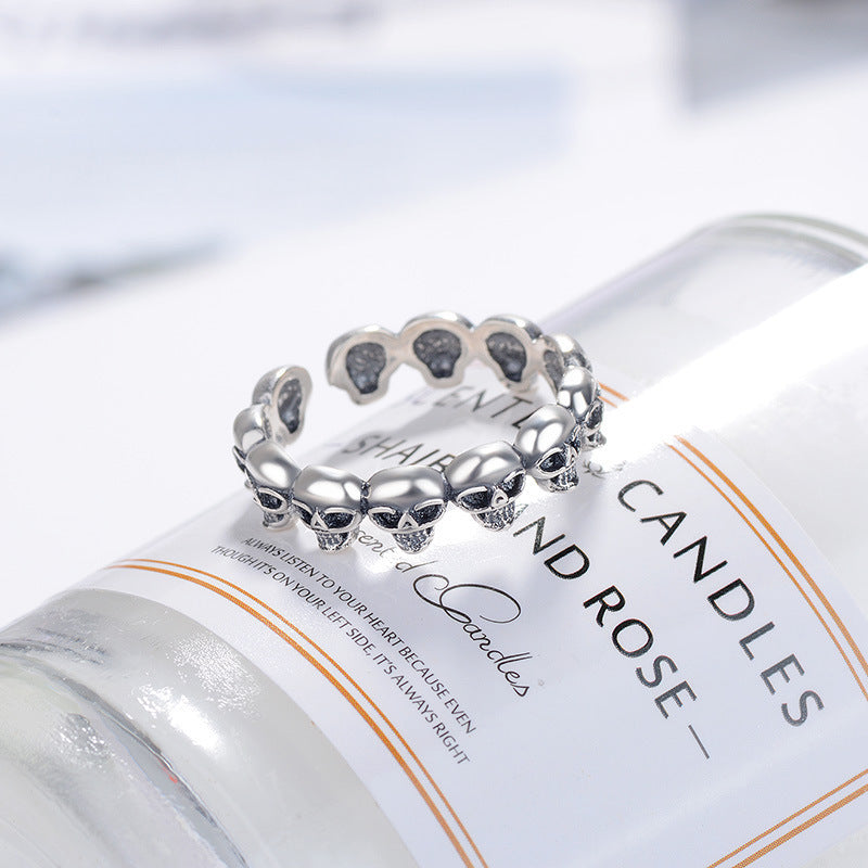 Unisex S925 Sterling Silver Skull Ring Adjustable Opening Retro Distressed Marcasite Jewelry Travel Commemoration