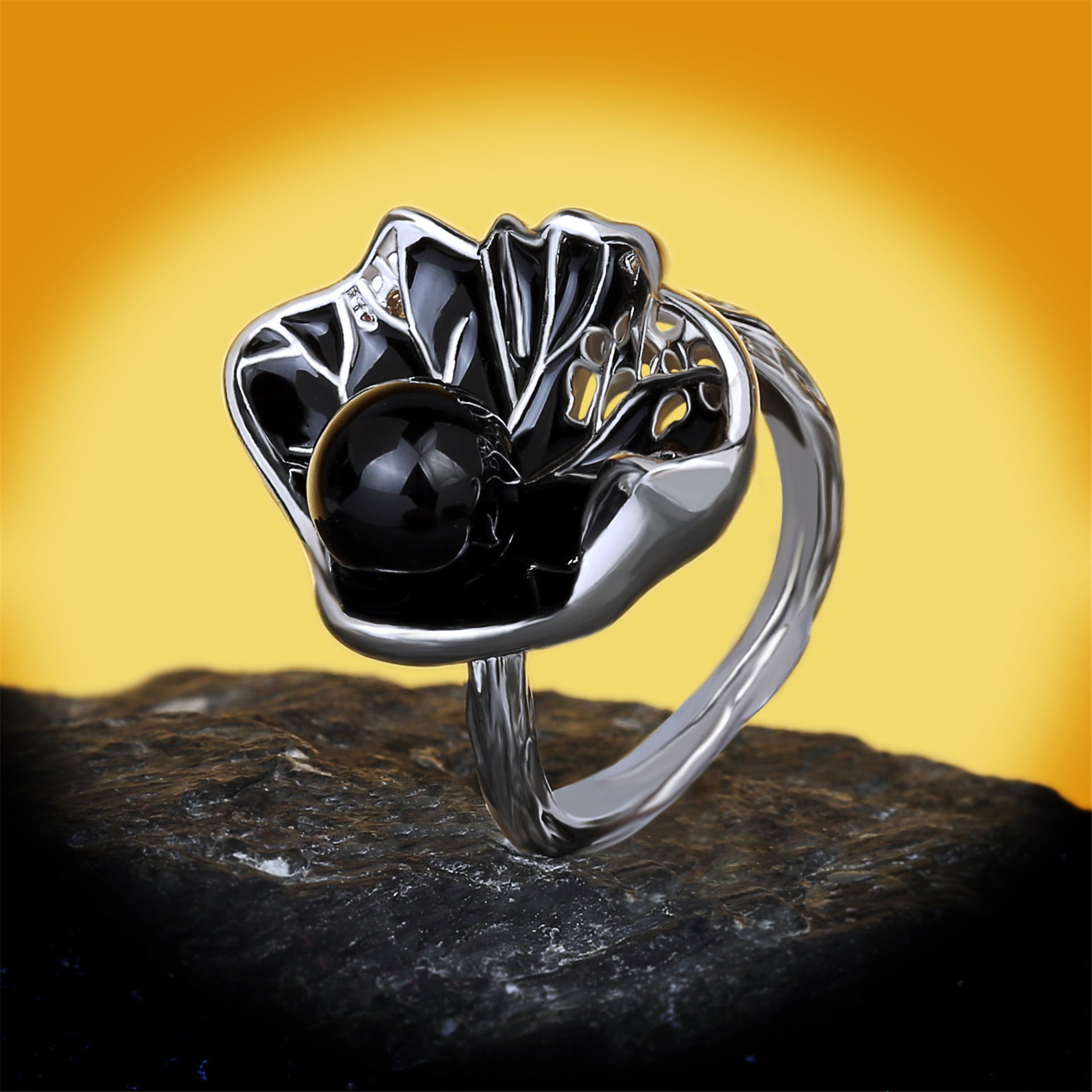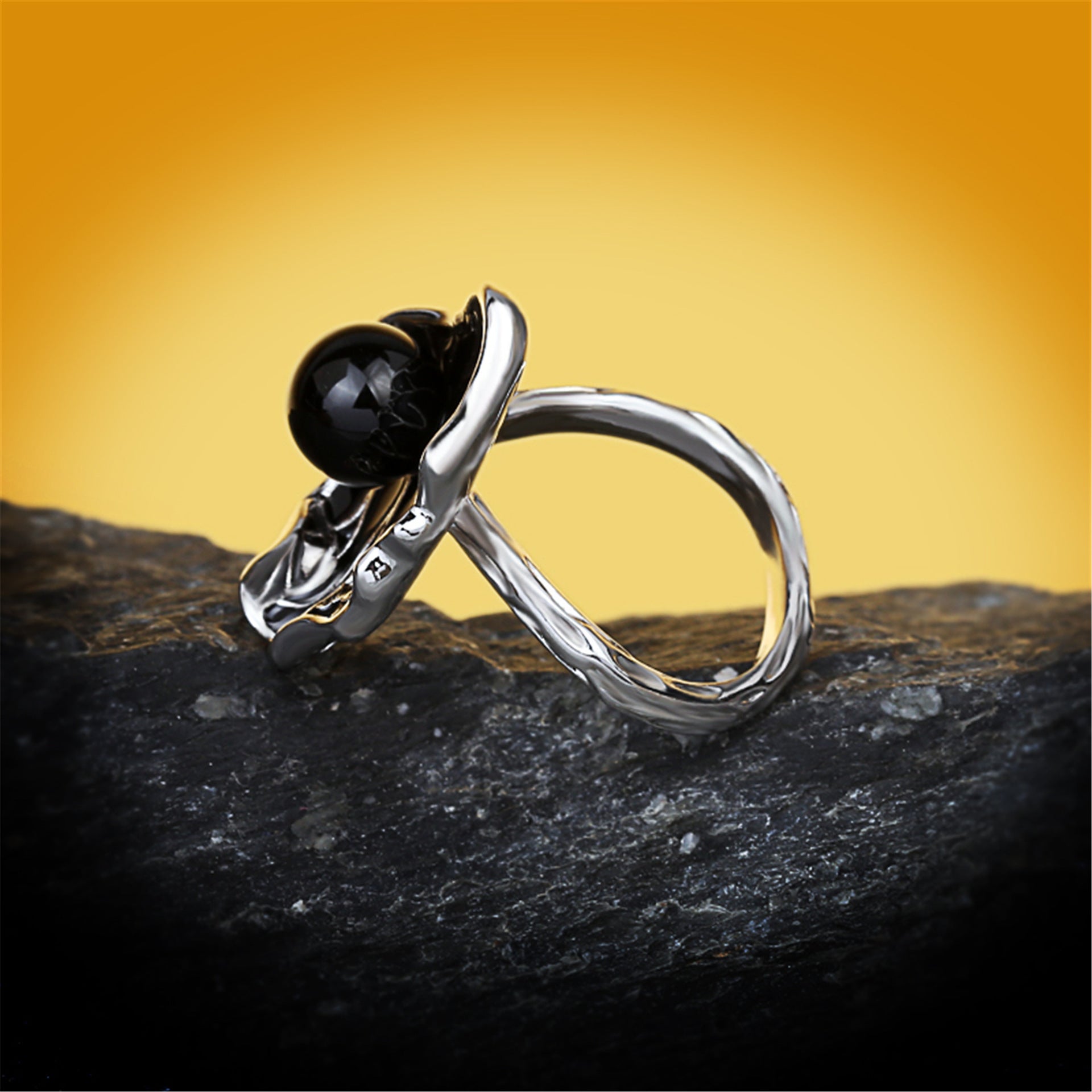Womens Agate Ring Lotus Leaf Design Vintage Brass Inlaid Flower Jewelry Elegant Fashion Accessory Art Deco Gem