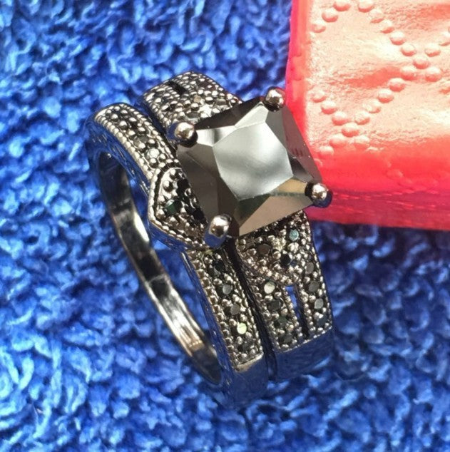 Womens Two Piece Heart Ring Set Black Gold Plated Gemstone Jewelry Elegant Stackable Promise Ring Anniversary Gift