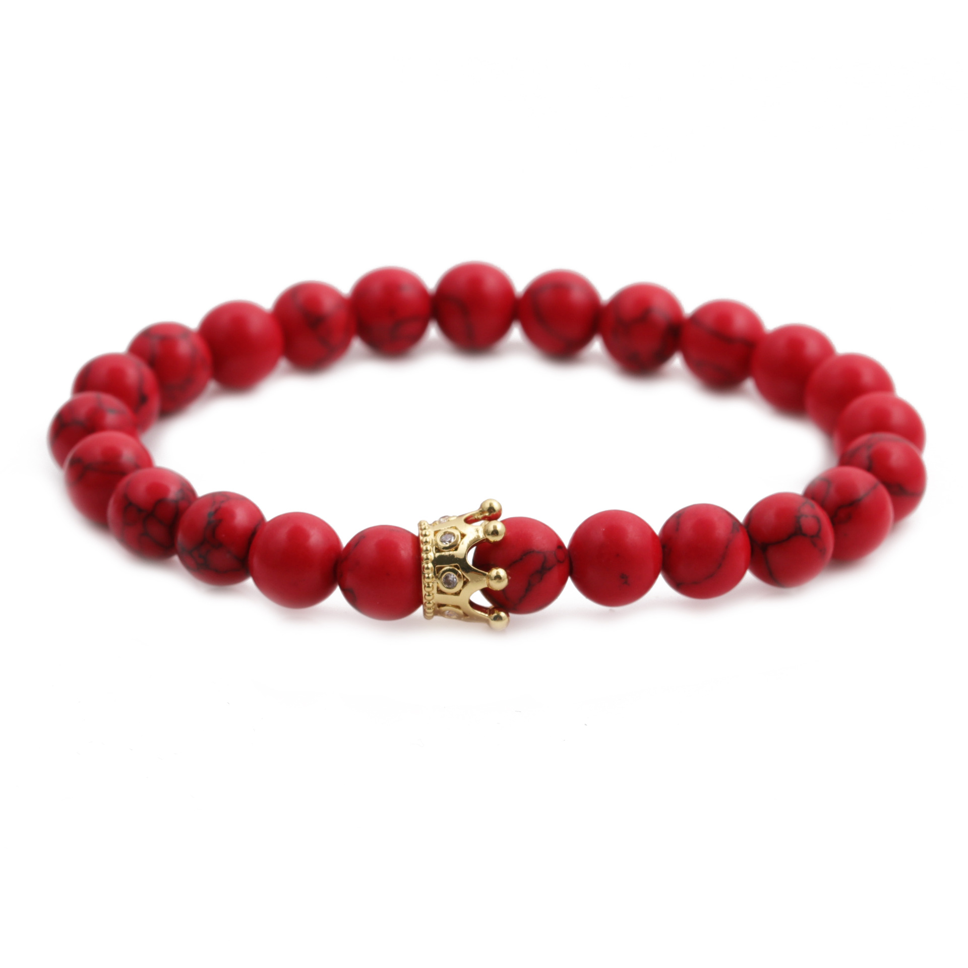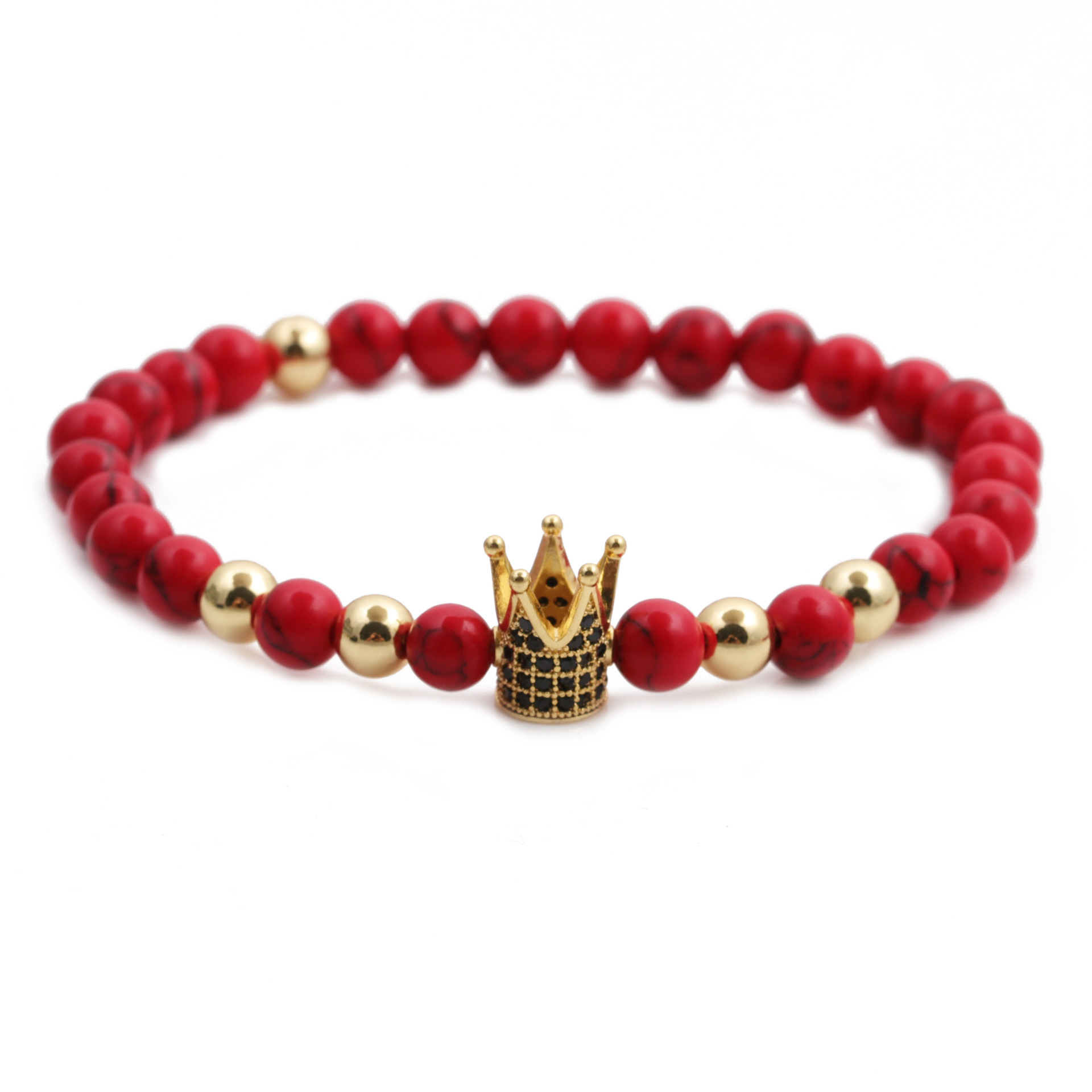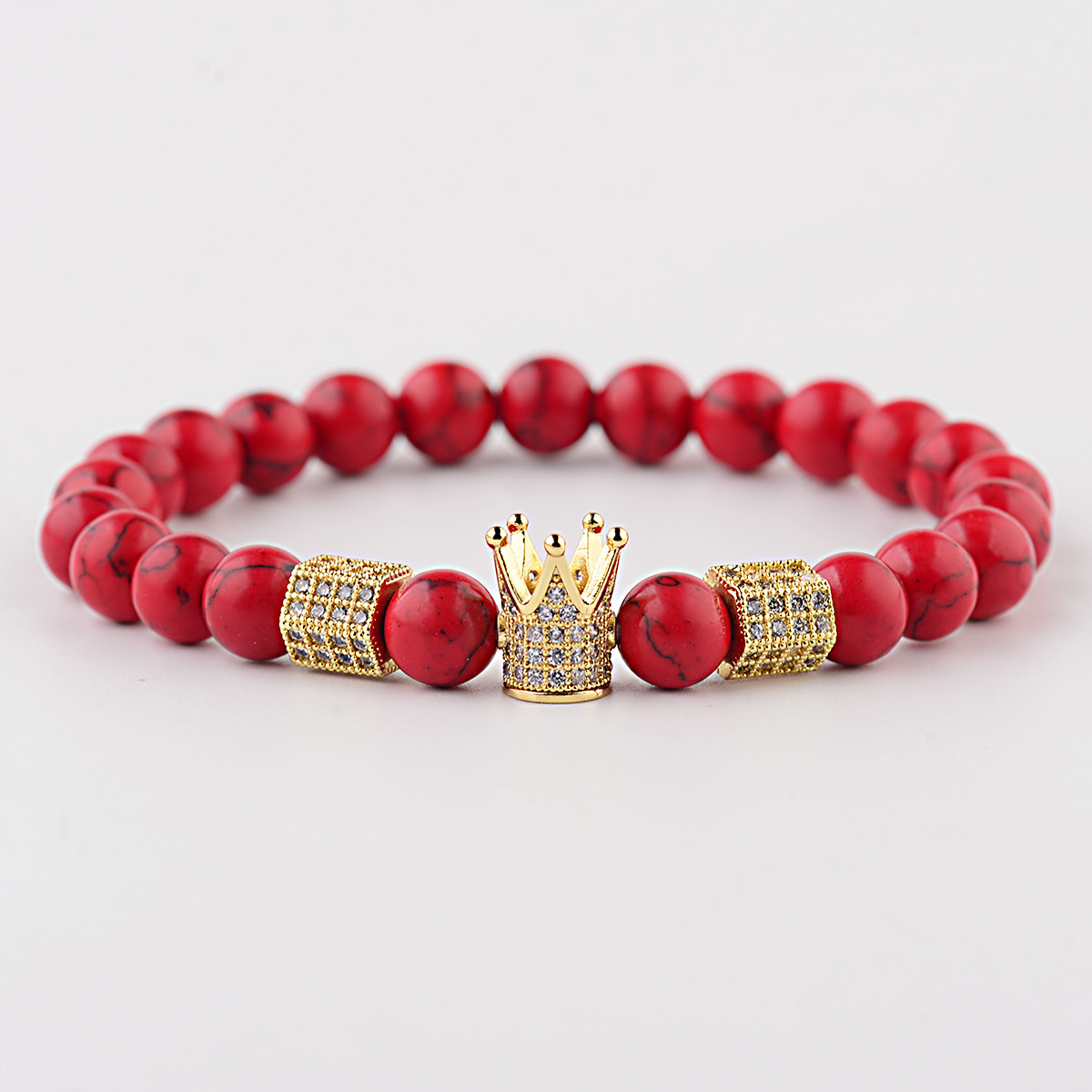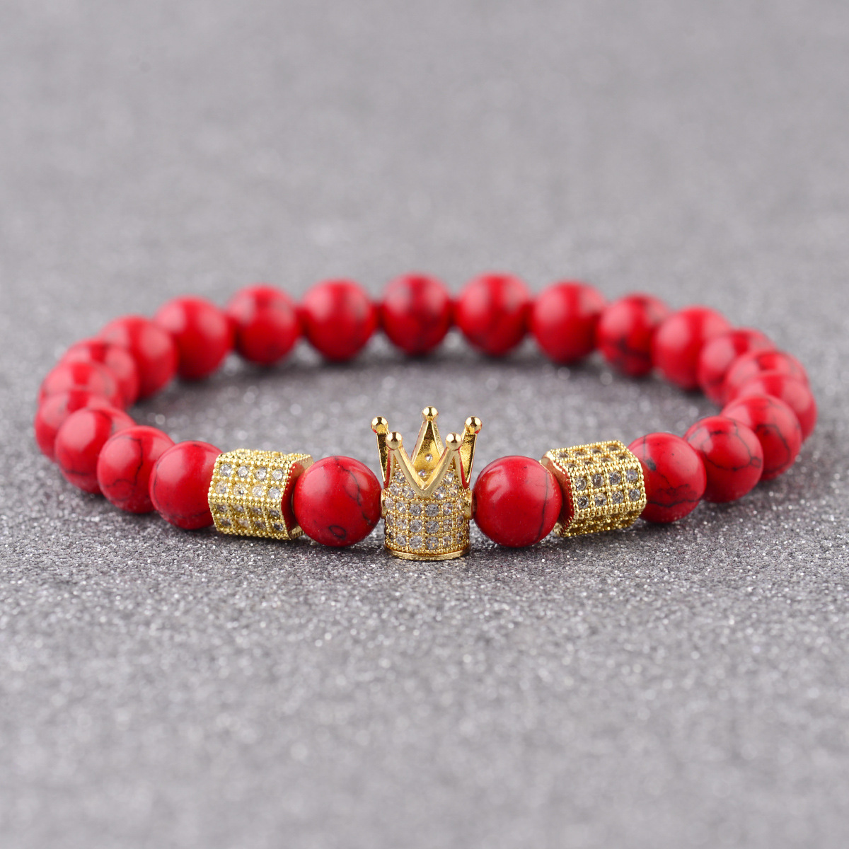 Red Pine Wood Bracelet With Copper Crown And Red Turquoise Accents Micro Inlaid White Zircon Elastic Cord Glow