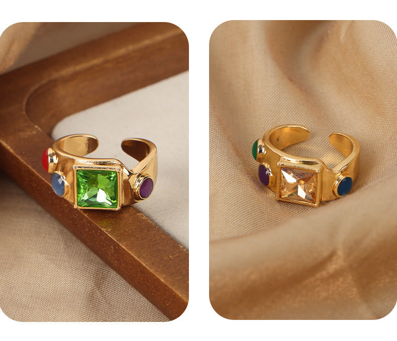 Women's Open Ring Natural Stone Ornament with White Zircon Beccarite Gold Copper Quadrilateral Geometry Element Ring Jewelry Gift for Her
