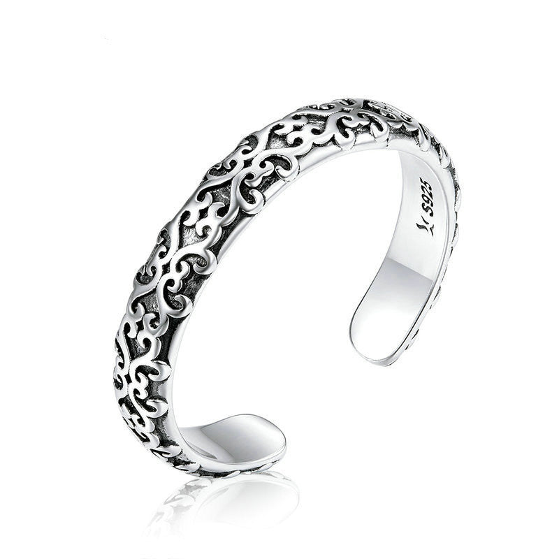 Womens Sterling Silver Adjustable Geometric Ring Vintage Pattern Design With Gem Inlay For Everyday Wear Sleek