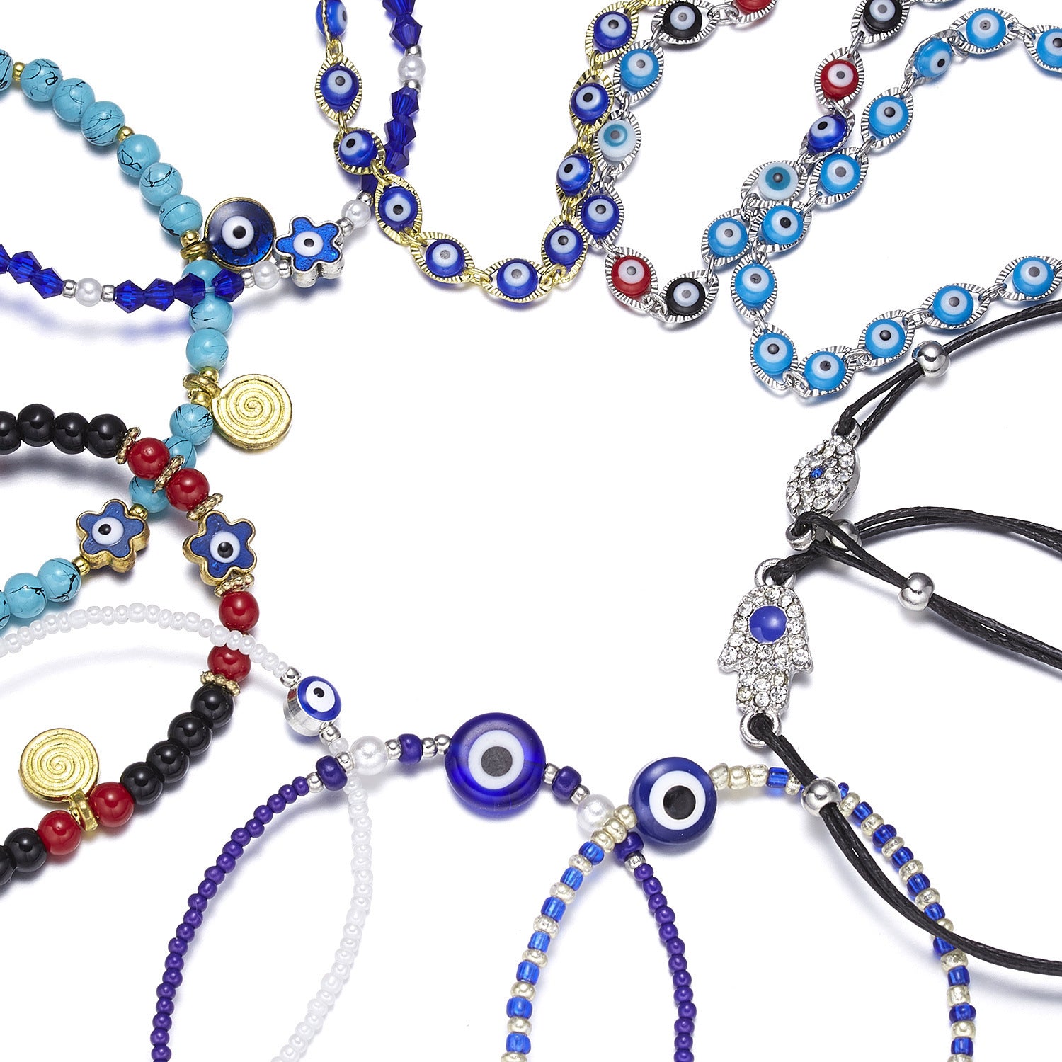 Womens Rhinestone Bracelet Palm and Evil Eye Charms Flowers Dragonfly and Geometric Elements Alloy LeatherRope
