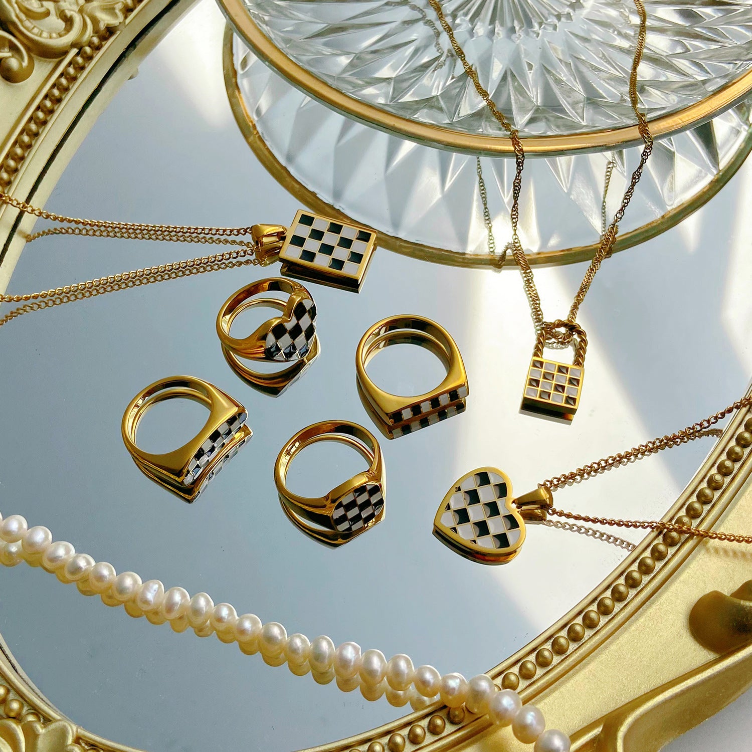 Geometric Stainless Steel Ring For Party Fashion Jewelry Plaid Chessboard Style Ring For Women Red Black Blue Colors