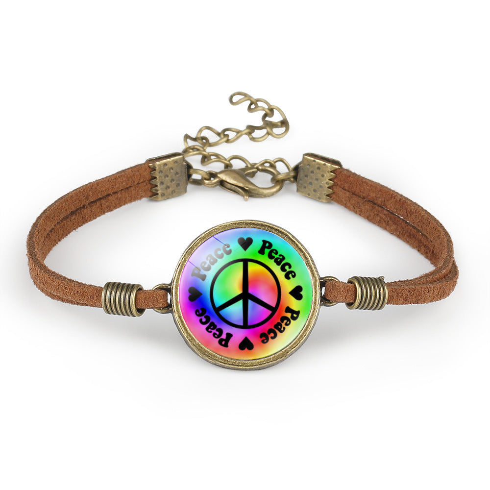 Unisex Leather Bracelet Peace Sign Retro Geometry Pattern With Crystal Inlay And Distressed Finish Packed Gift