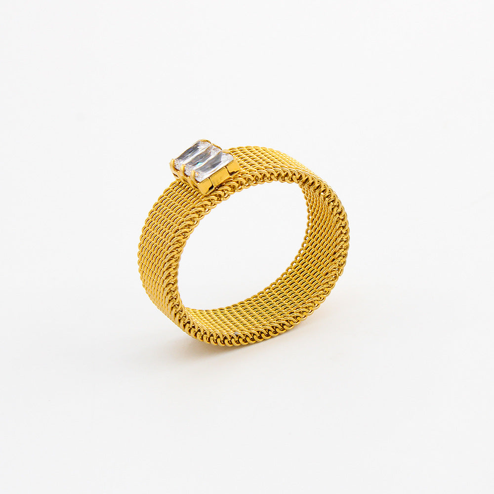 Unisex Stainless Steel Mesh Ring Inlaid Zircon Geometric Designs Electroplated Jewelry White Green Size 6 7 8 9