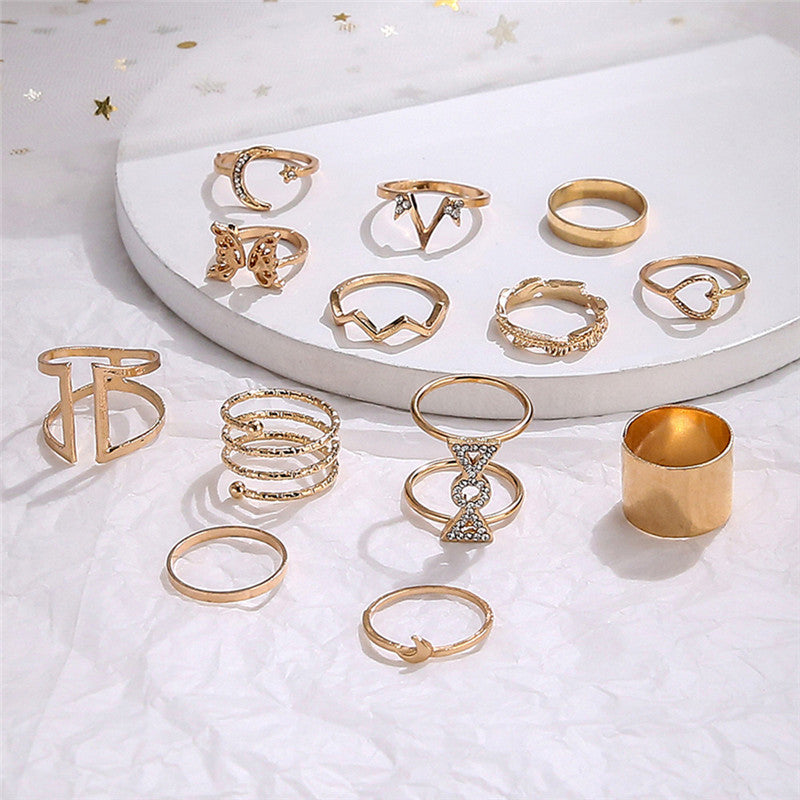 Women Alloy Ring Set 13 Pcs Geometric Diamond Butterfly Love Rings Electroplated European Style Jewelry Collection