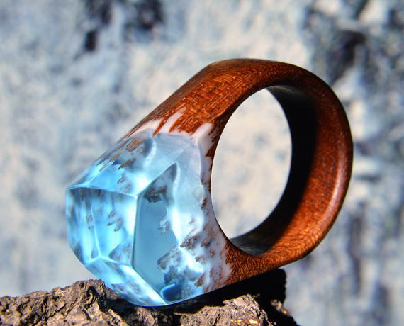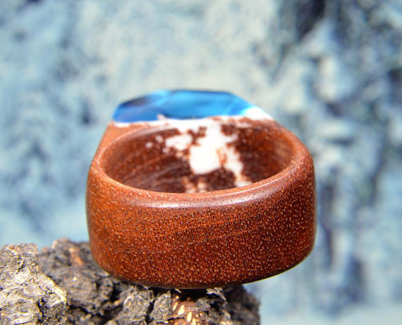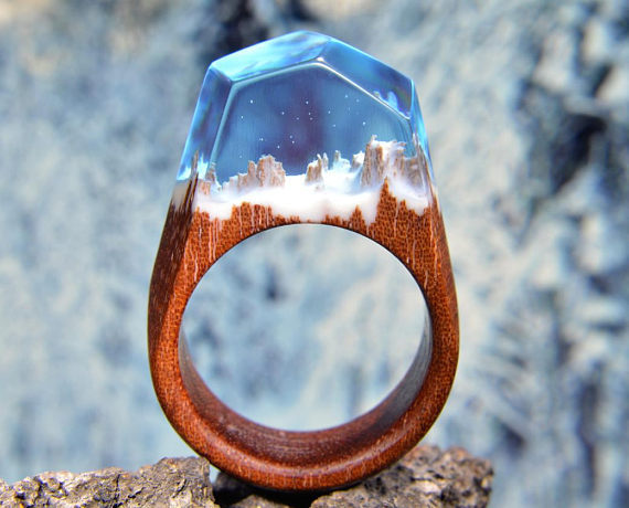 Unisex Wooden Ring Vintage Wood With Royal Deep Blue Resin Enchanted Forest Mountain Peak Design Birthday Gift