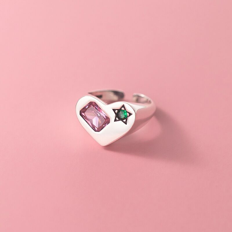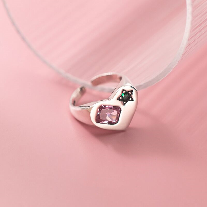 Adjustable Copper Ring For Women With Love Star Zircon Accent Electroplated Retro Silver Tone Gift For Birthday