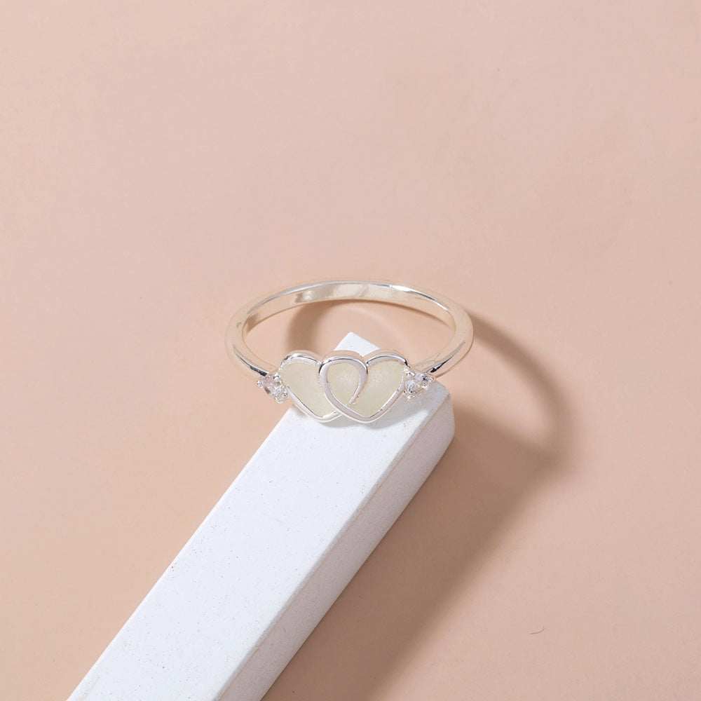 Womens Double Heart Ring Copper Band With Light Blue Zircon European Zodiac Design Electroplated Oil Drip Finish