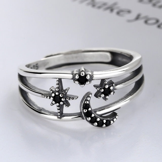 Sterling Silver Moon And Star Open Ring Vintage Geometric Design 925 Jewelry For Women Daily Wear Elegant Accessory