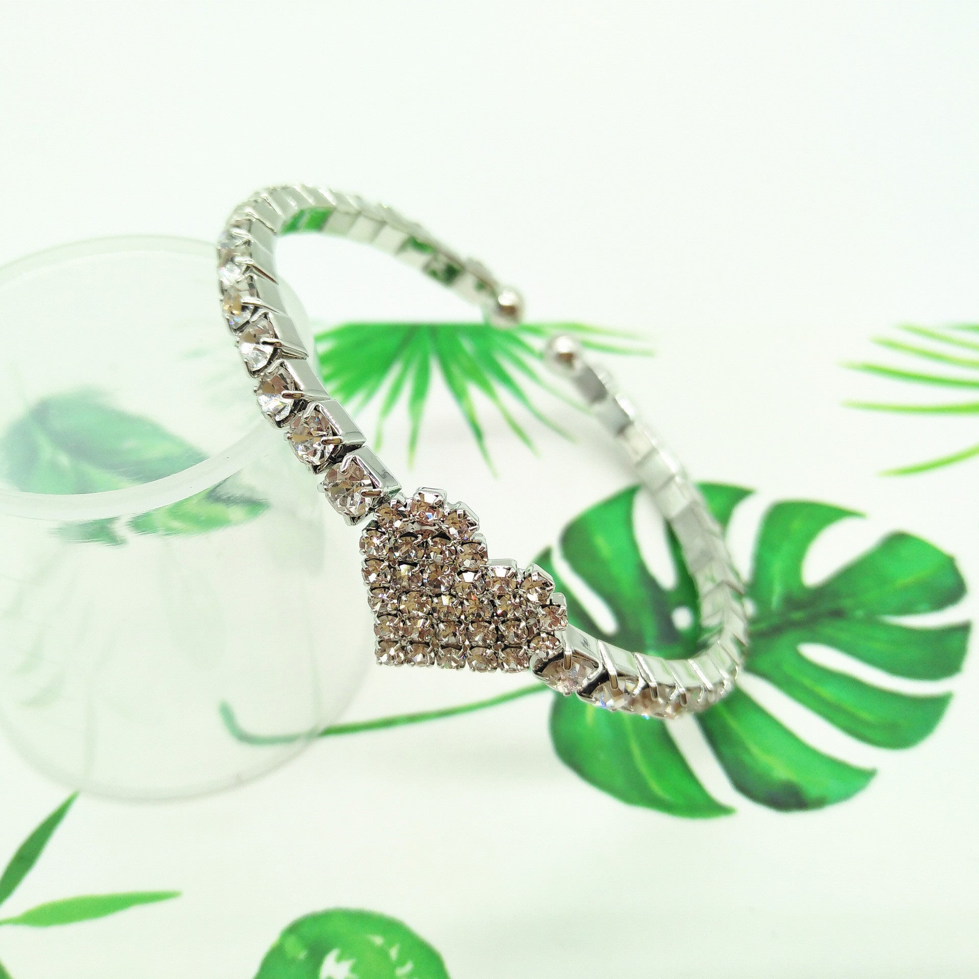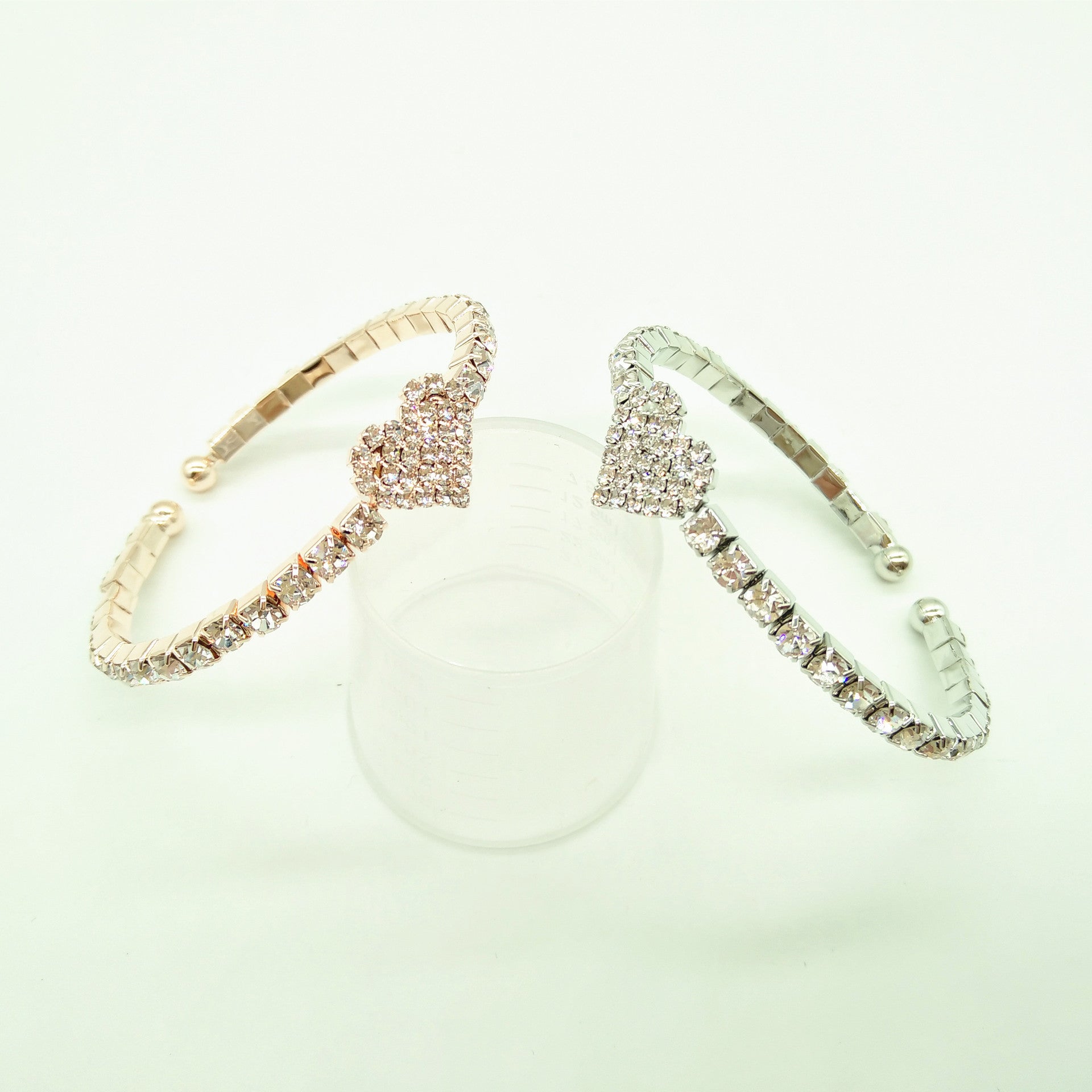 Couple Heart Shaped Alloy Elastic Bangle Bracelets Set With Gemstones In Gold Silver Rose Gold Finishes Inner 50mm