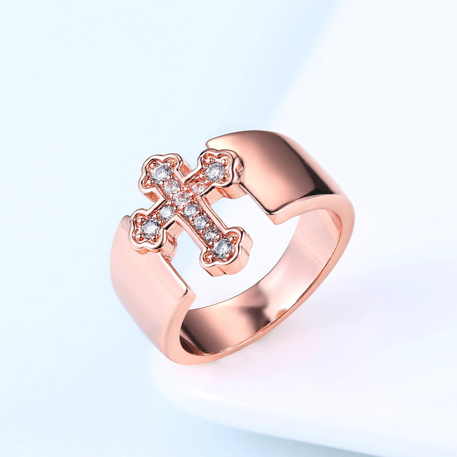 Womens Rose Gold Plated Copper Ring Inlaid Zircon Cross Design 1.5cm Wide Surface Ring For Women And Girls Now