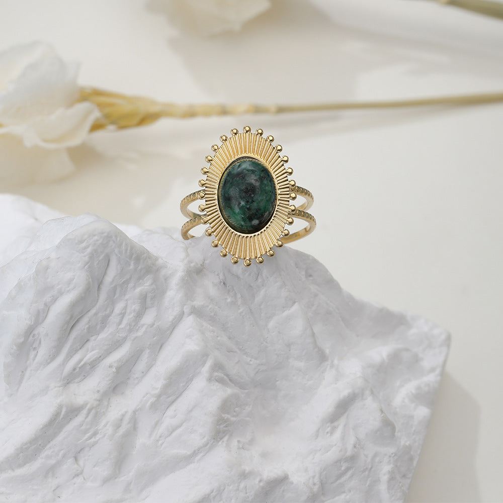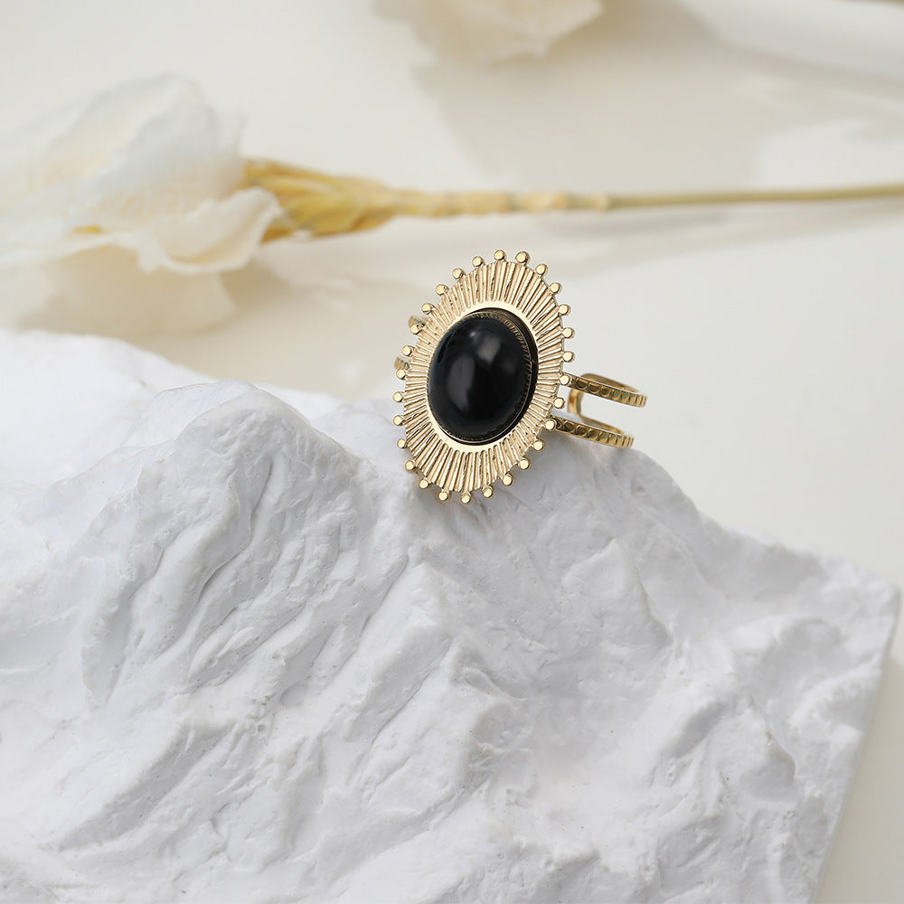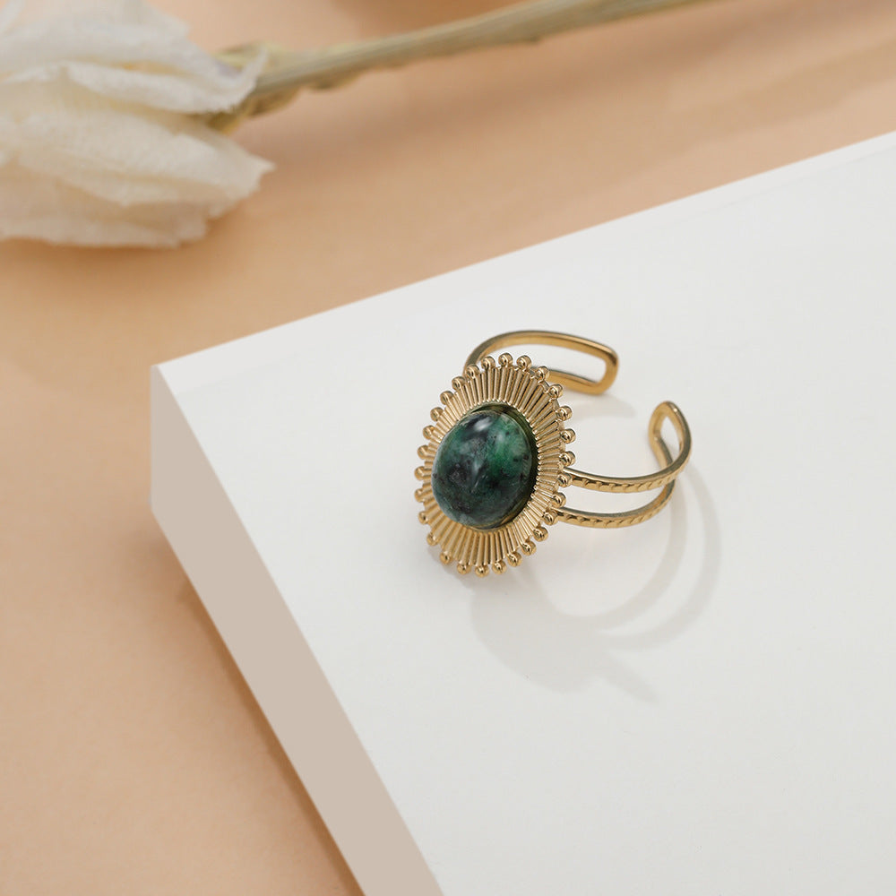 Unisex Stainless Steel Ring with Black Stone and Green Stone Adjustable Opening Geometric Retro Ring for Men and Women Titanium Steel Band