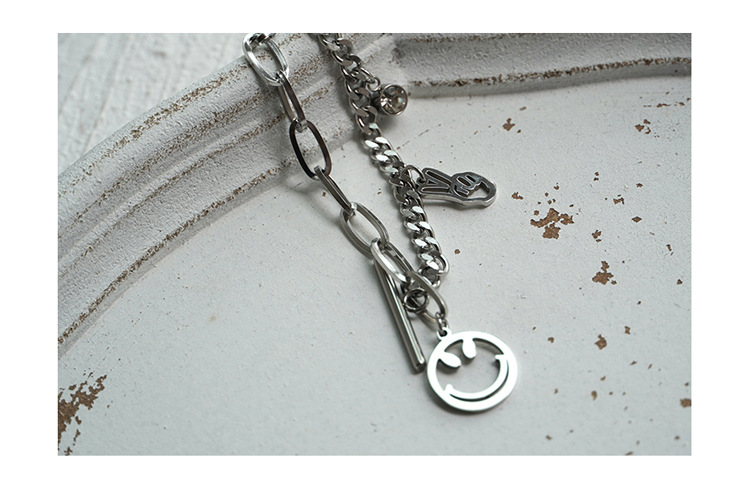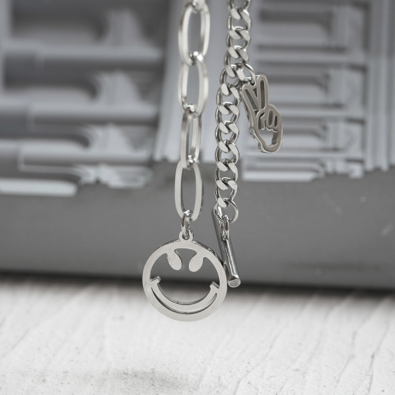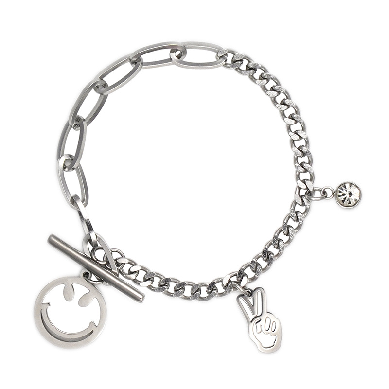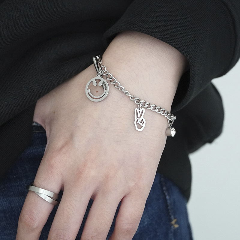 Unisex Titanium Steel Bracelet Rhinestone Smiley Face Victory Gesture Zodiac Design Chain Nineteen Centimeter Chain