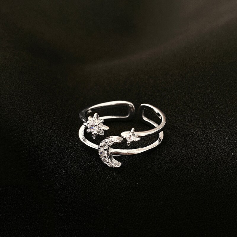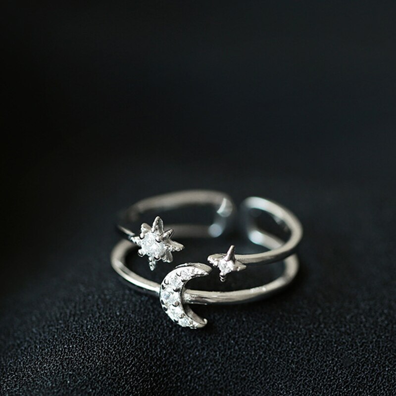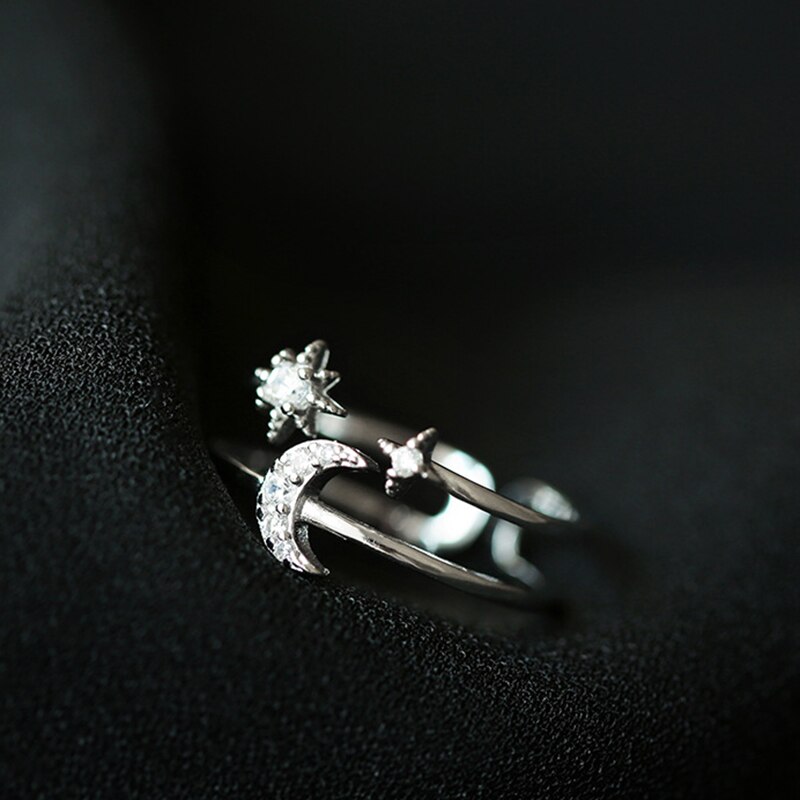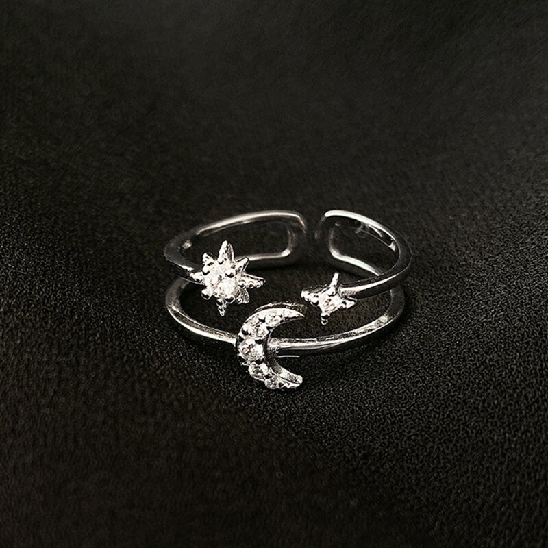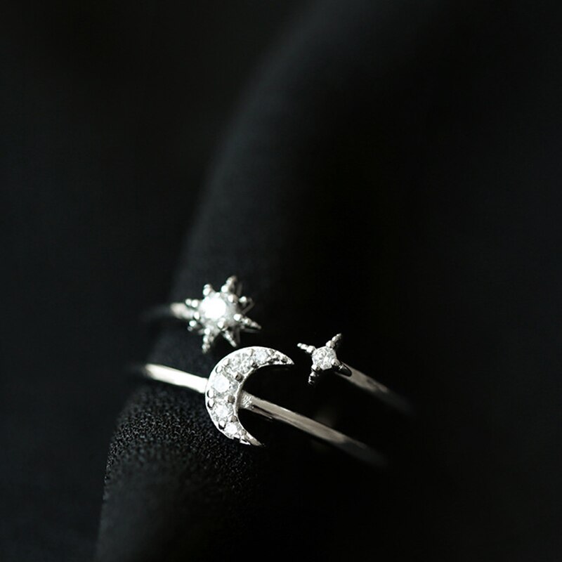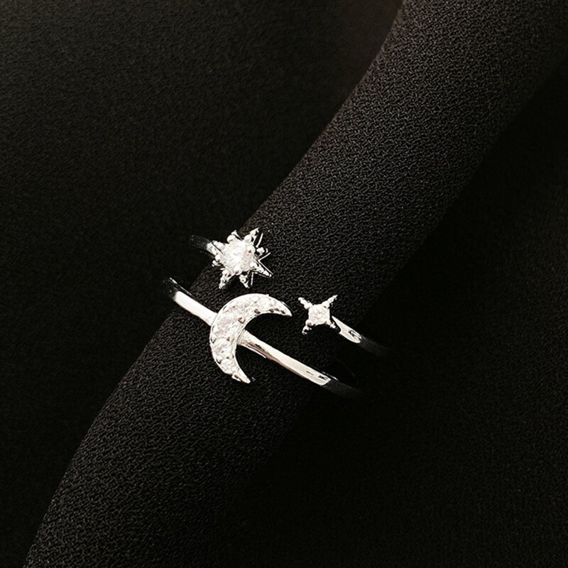 Sparkling Diamond Star Moon Ring White Gold Inlay Details