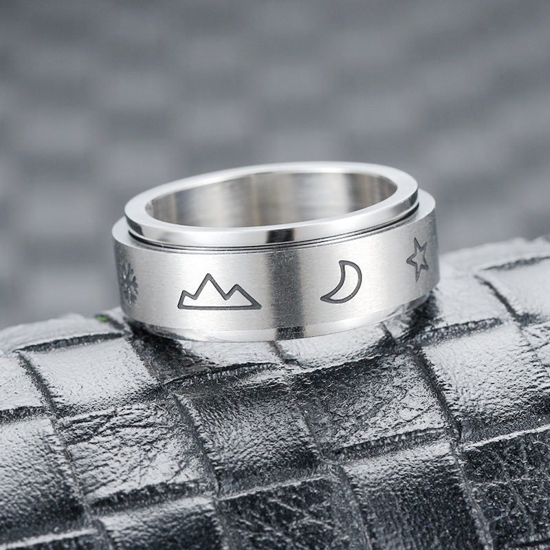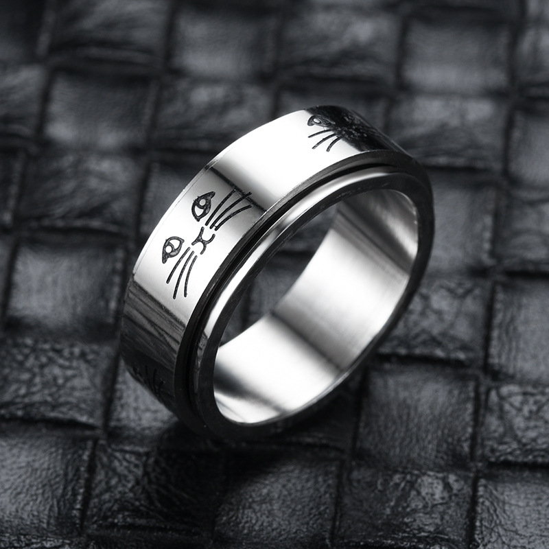 Rotating U Shape Stainless Steel Ring With Moon Design And Lightning Accent Plus Cat Detail Geometric Elements
