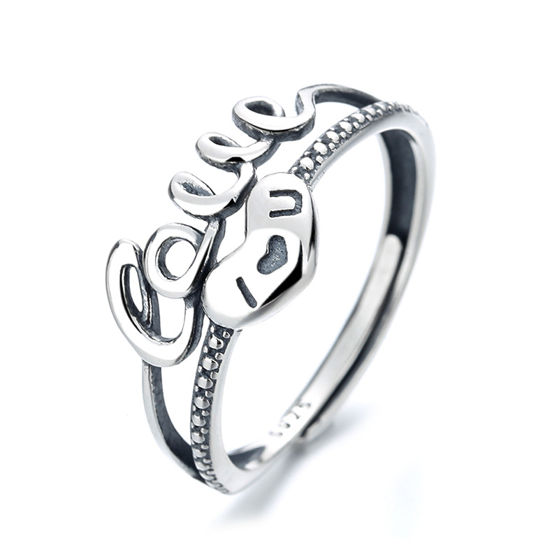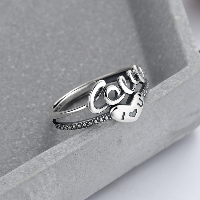 Womens Sterling Silver Ring Adjustable Opening Band With Retro English Word Stitching Design Jewelry Gift For Her