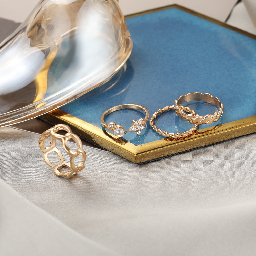 Womens Golden Alloy Ring Set With Rhinestones Heart Shaped Twist Design 4 Piece Jewelry Set Collection Gift For Her
