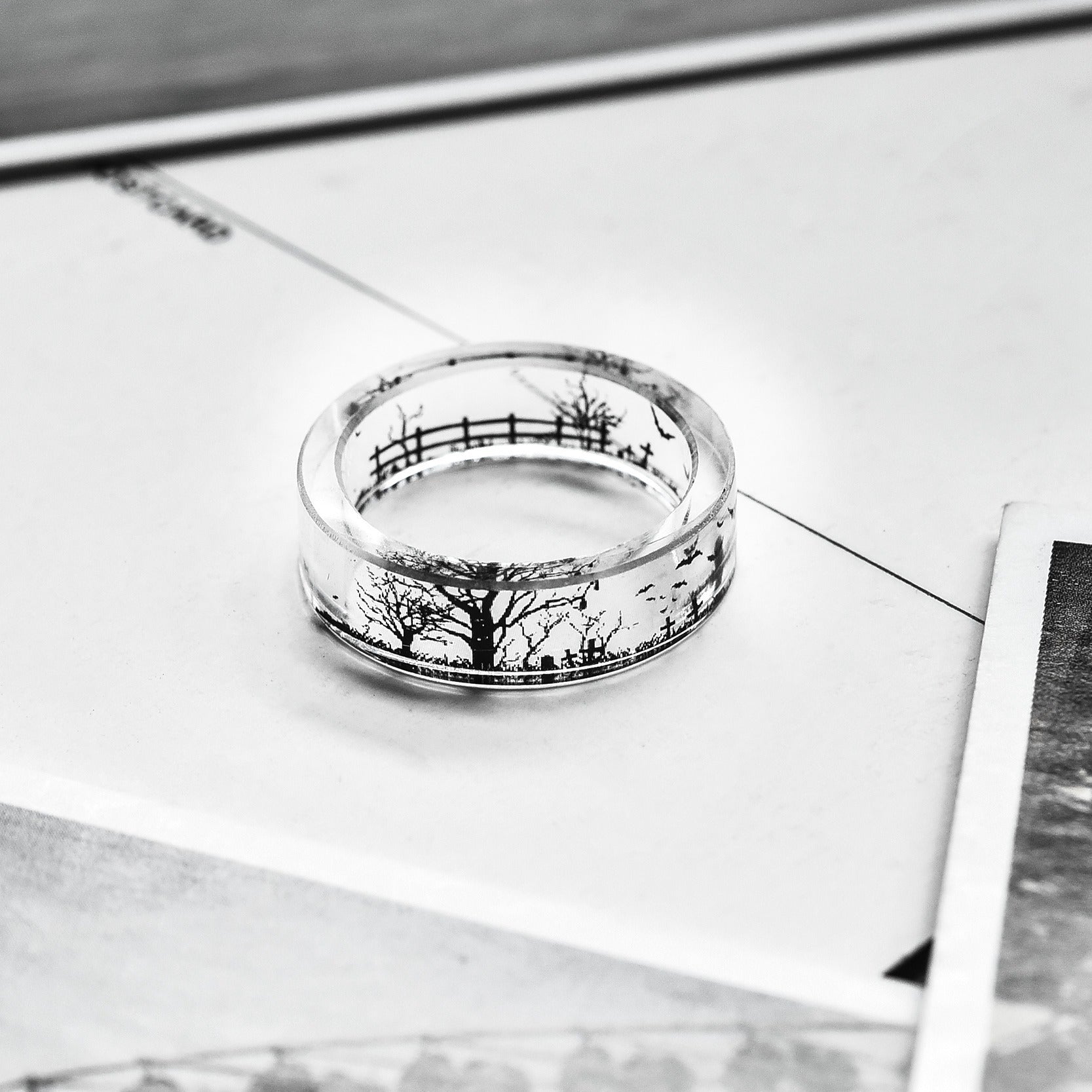 Tree Resin Black And White LandscapeArt Gemstone Epoxy Ring Unisex Simple Style Sizes 17mm 18mm 19mm 20mm 21mm