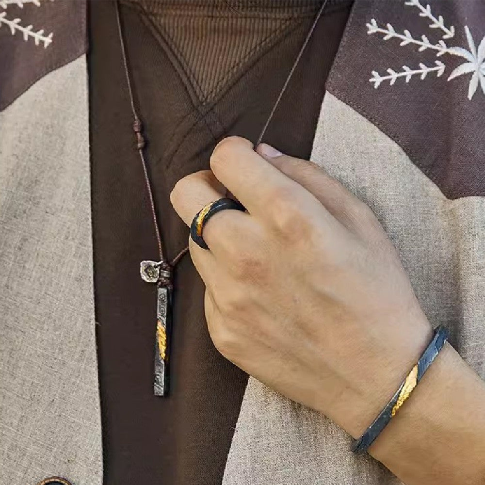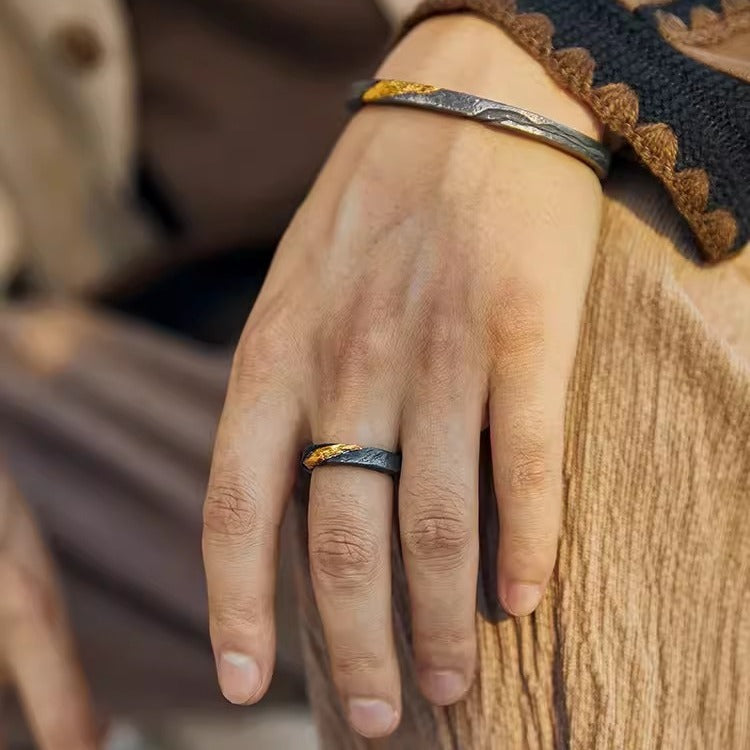 Trendy Sterling Silver Retro Open Mouth Ring Inlaid 24KGold Geometric Fold Chain Unisex Adjustable Chic Style