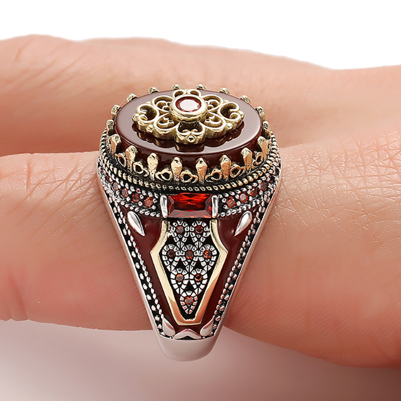 Vintage Two Tone Mens Red Onyx Ring Alloy Inlay Semi Precious Stone Classic Jewelry Accessory Handcrafted Item