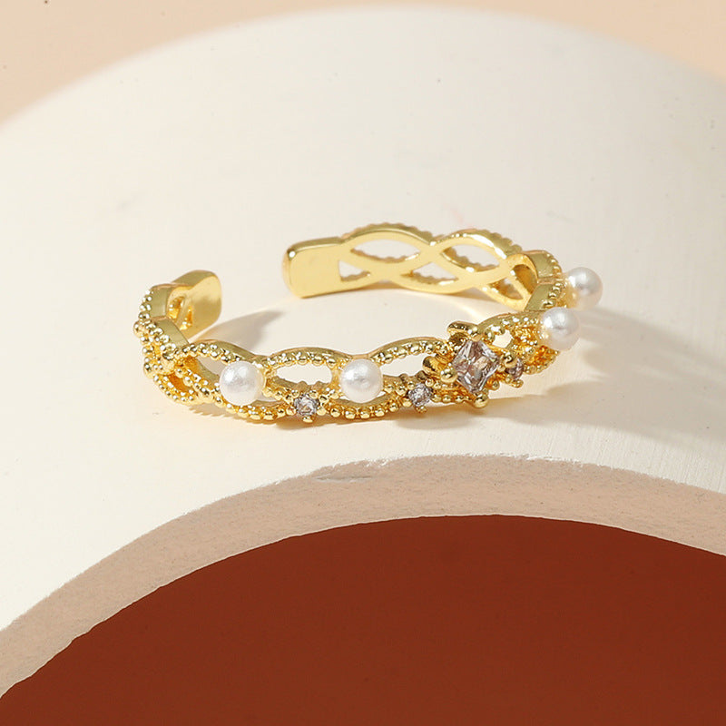 Womens Adjustable Copper Ring With Zircon Inlay Geometric Pearl Open Band Golden Design Lightweight Light Feel