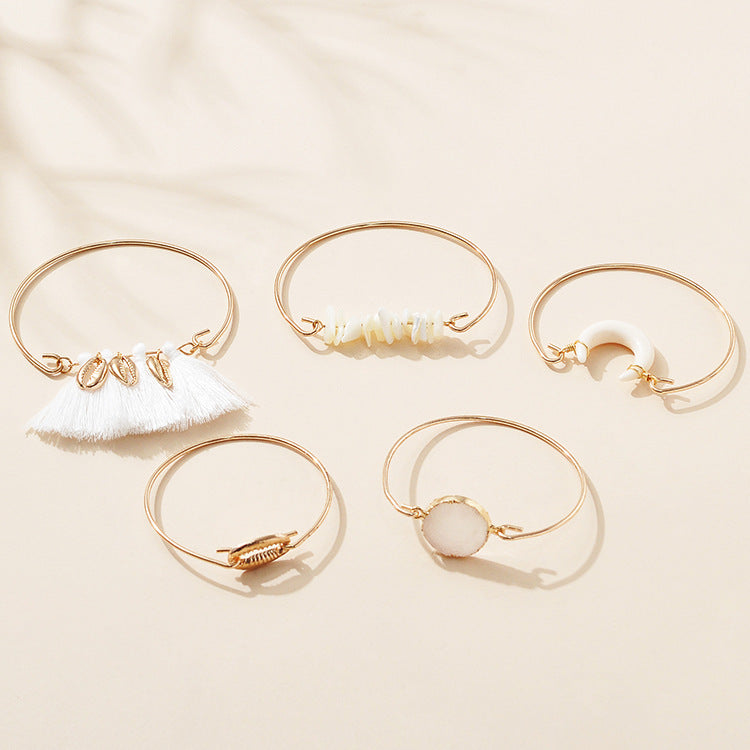 Womens Alloy Shell Tassel Bracelets Set Of Five Pieces Electroplated Gold Finish Boho Chic Jewelry Accessories