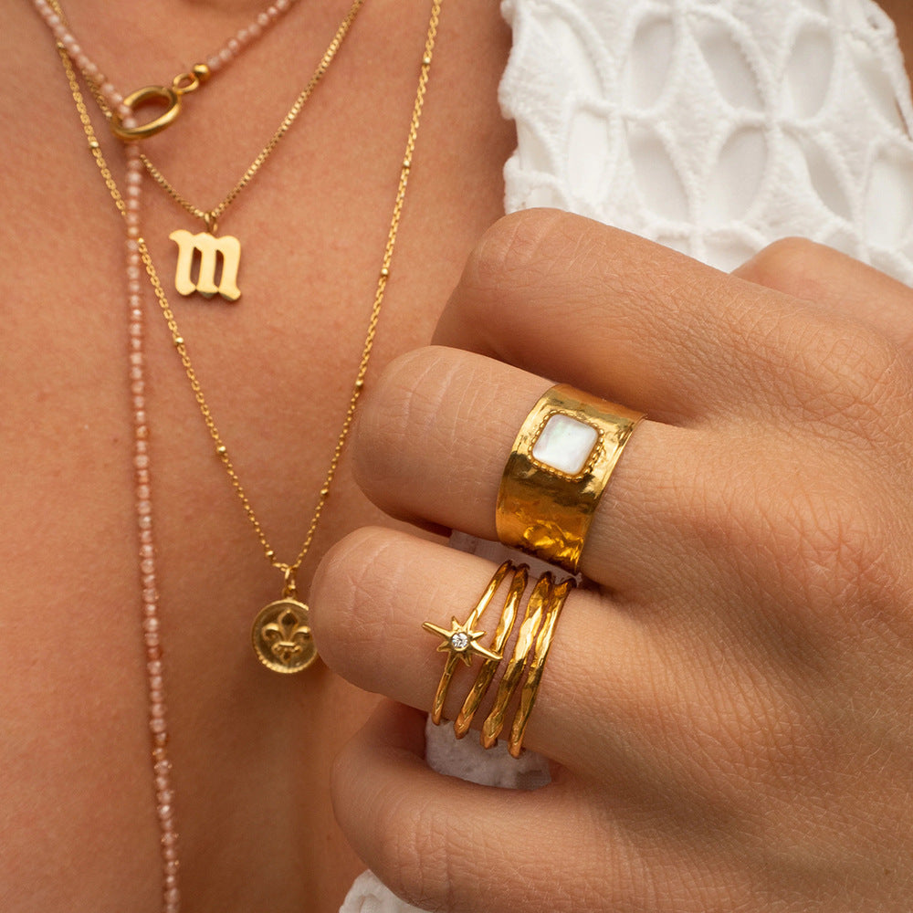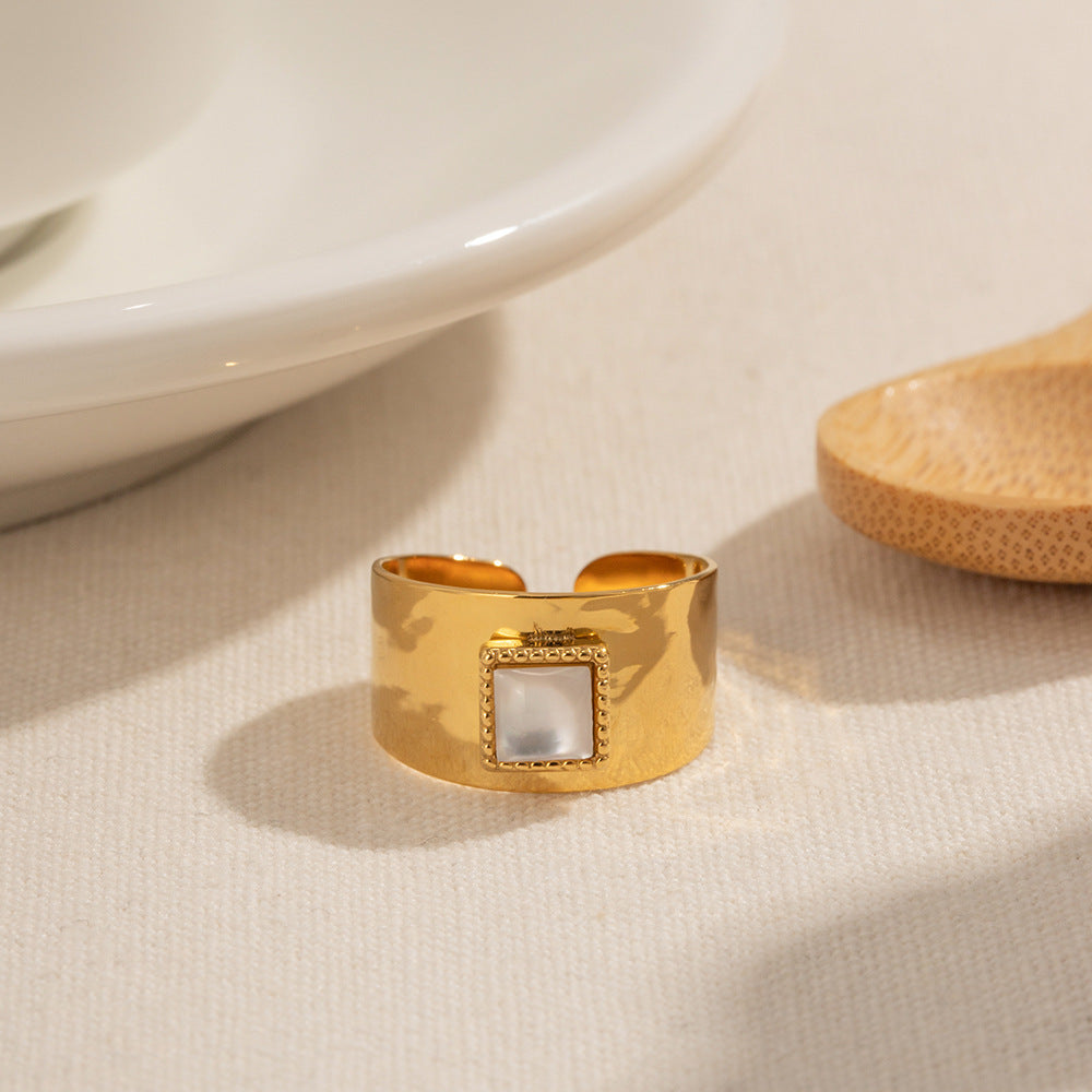 Women Fashion Retro Stainless Steel Inlaid Fritillary Ring Adjustable Split Band Elegant Flower Motif Jewelry Gift Idea