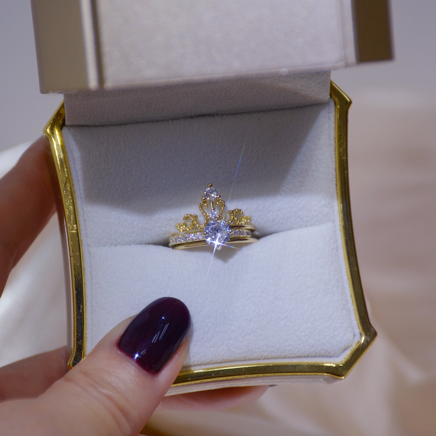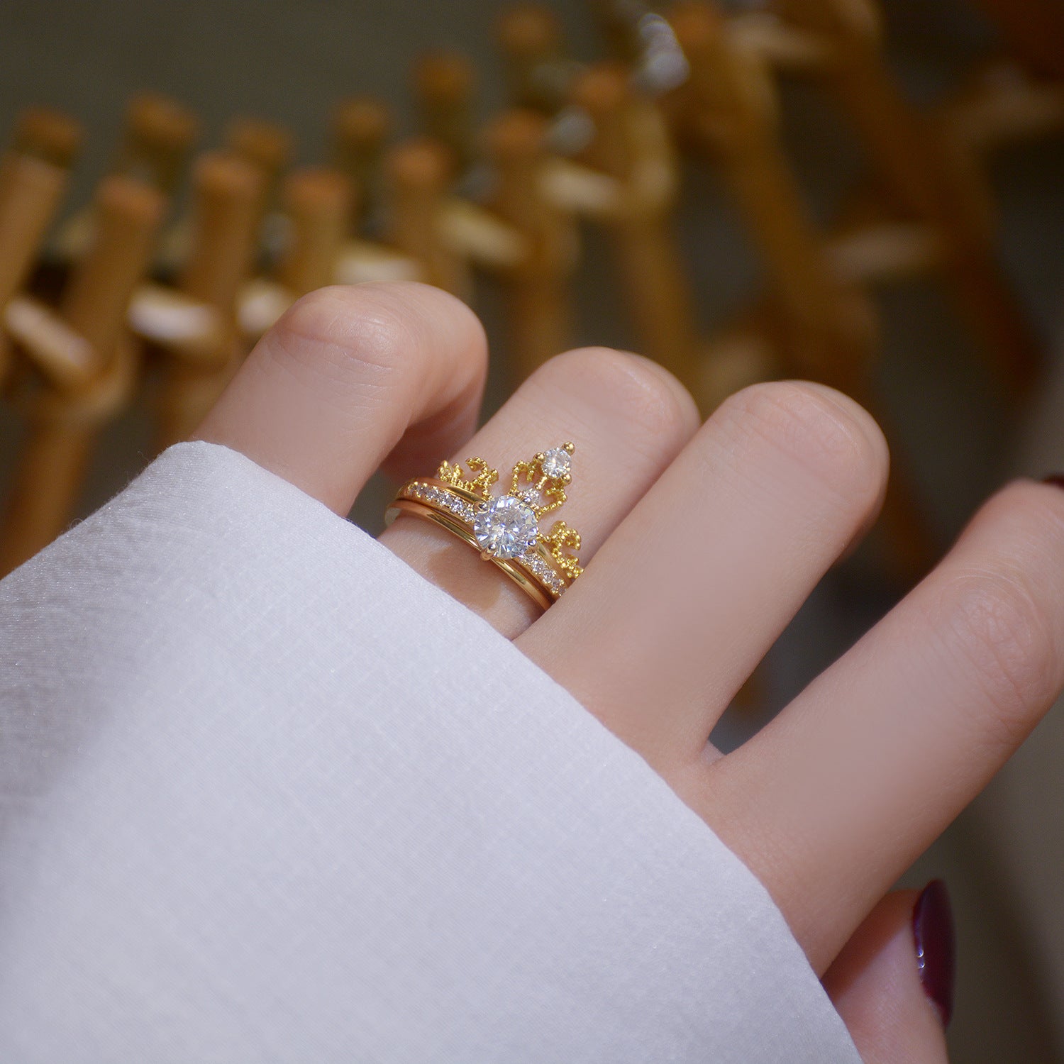 Womens Fashion Copper Zircon Ring Set Micro Inlaid Adjustable Crown Style Korean Couple Jewelry Elegant Allure