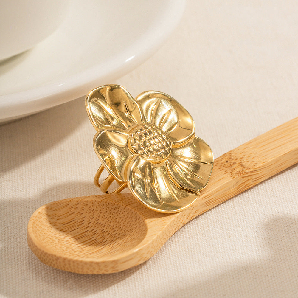 Womens Stainless Steel Ring Geometric Flower Vein Design Gold Tone Non Fading Jewelry Elegant Jewelry Gift Set