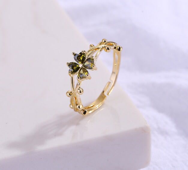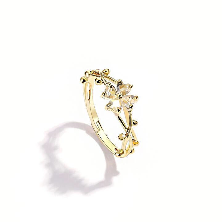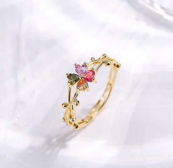 Flower Ring for Women Gold Plated Alloy Inlaid Gems Four Petals Korean Style Ring Individually Packed Gift Box Included