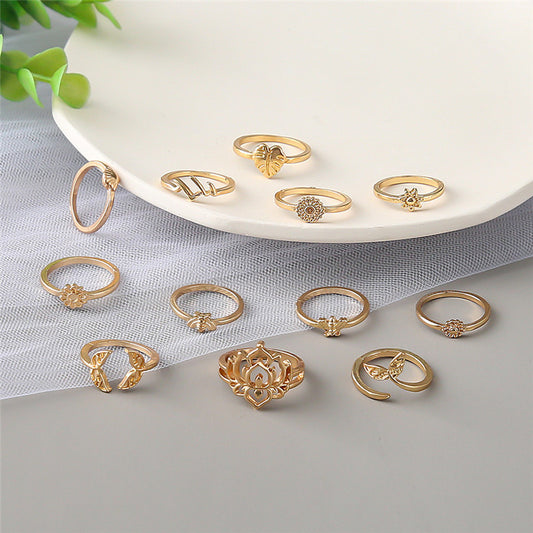 12 Piece Vintage Alloy Ring Set With Star Moon Sun Face Designs Electroplated Fashion Jewelry Collection Style